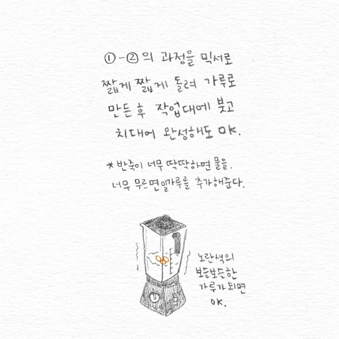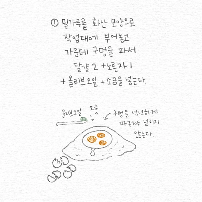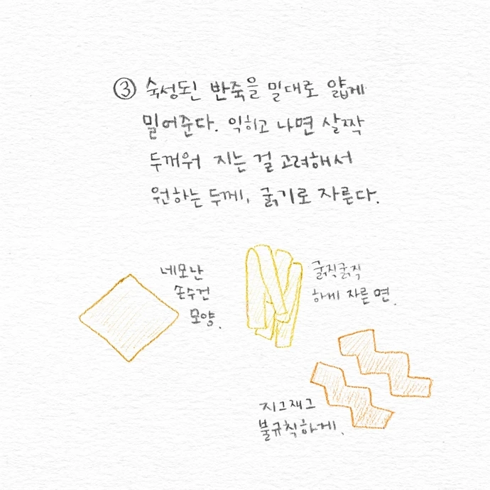 시행착오를 할 때마다 당신의 마음은 조금씩 두꺼워진다. 거울로는 비출 수 없는 두터워진 마음을 꺼내보고 싶을 때, 당신은 파스타를 만든다. 밀가루에 계란을 더해 포크로 휘휘 저으면, 가루는 노랗게 점점 뭉쳐지다 둥그런 하나의 덩어리가 된다. 더 대담해지라는 주문을 외우면서 파스타 반죽을 치댄다. 당신은 완성된 파스타 면을 납작하게 밀어 원하는 대로 굵직하게 잘라본다. 본인 마음의 두께를 가늠해본다.