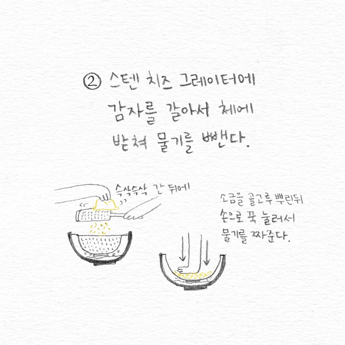 같은 재료를 바탕으로 비슷한 과정을 거친 요리도 어떤 도구를 사용하느냐에 따라 전혀 다른 식감으로 완성된다. 감자전을 만들 때 감자를 갈아내는 작은 가시가 위로 솟아 있는 강판을 사용하면 쫀득한 질감의 감자전이 되고, 서걱서걱 얇게 채쳐지는 작은 구멍이 난 스테인리스 강판을 사용하면 감자의 맛이 선명한 바삭한 식감의 감자전을 만들 수 있다.