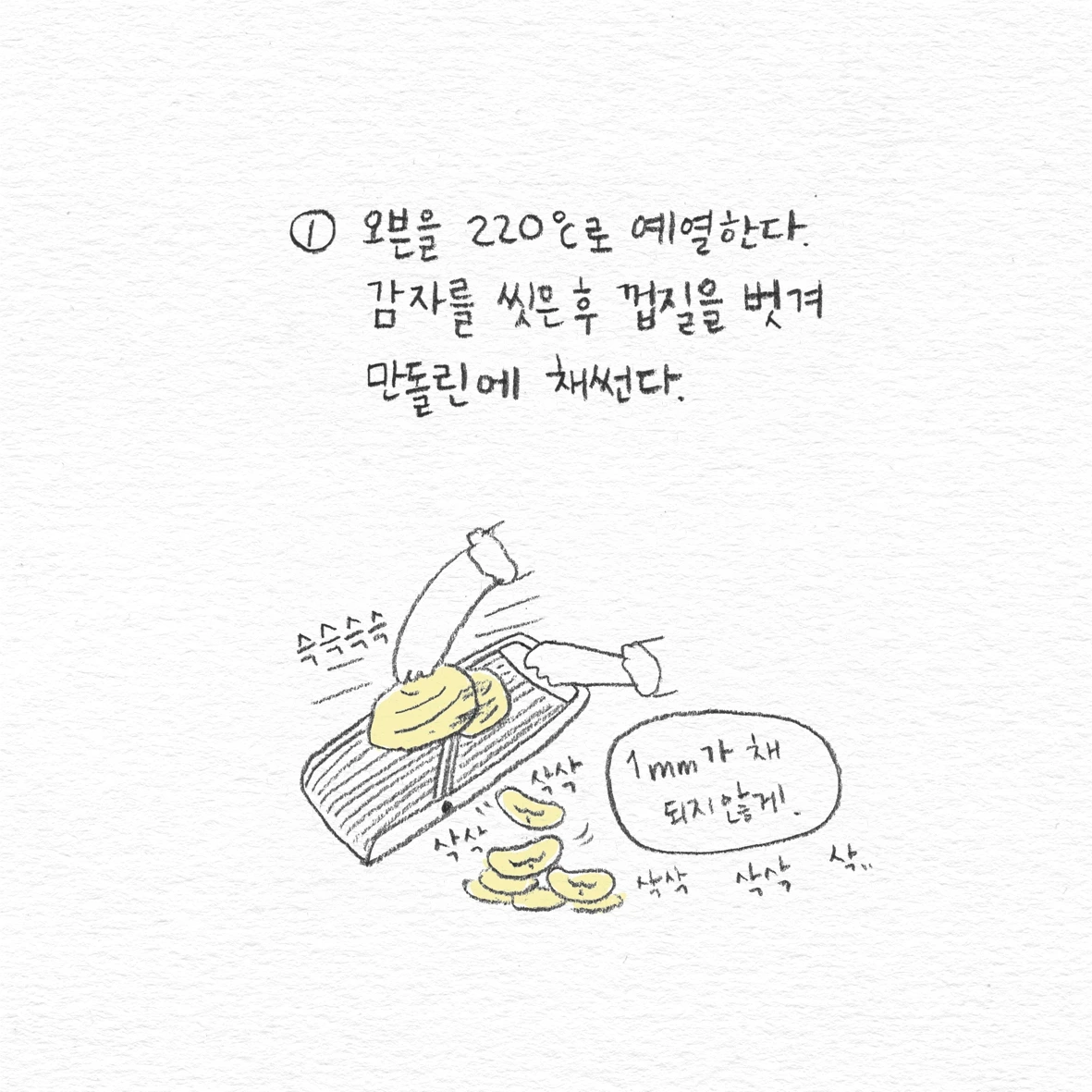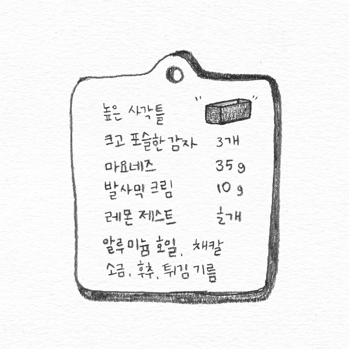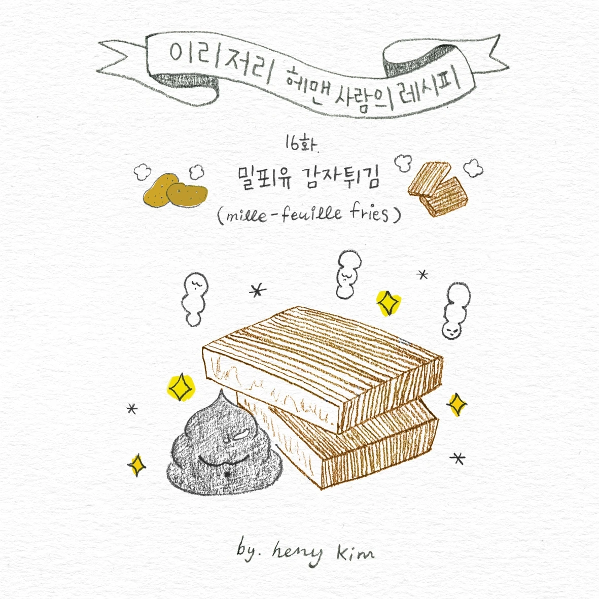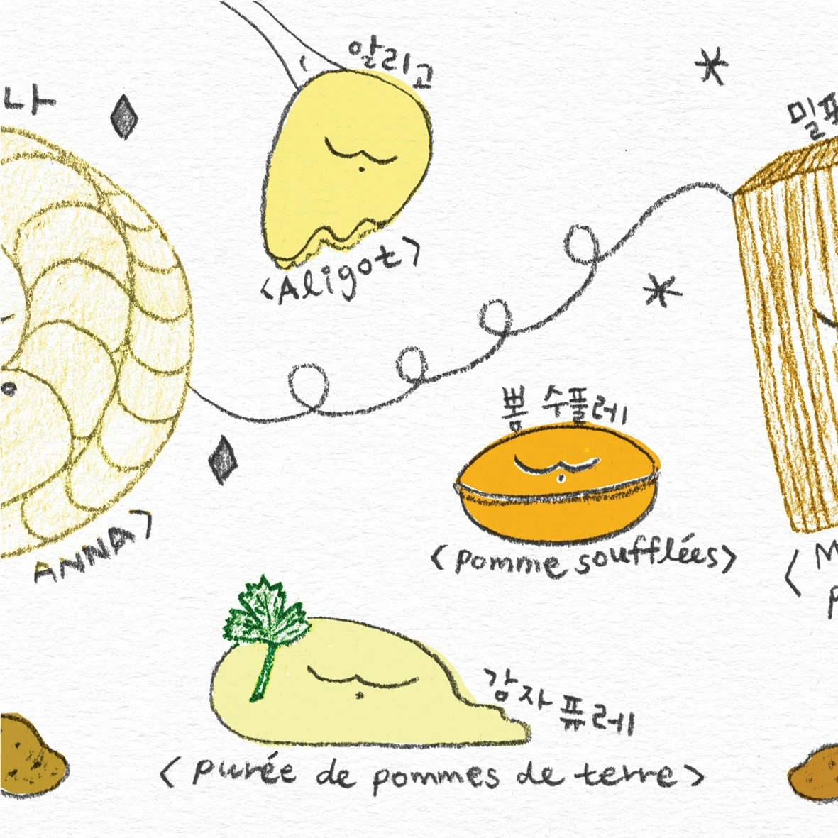 그 중에서 뽐 안나(Pommes Anna)는 감자를 일정한 두께로 썰어 동그란 틀로 찍어낸 뒤 한겹 한겹 버터를 발라 차곡차곡 쌓아서 구워낸 요리이다. 뽐 안나를 색이 나지 않게 구워낸 뒤 뜨거운 기름에 튀겨내면 겉은 감자칩보다 바삭하고 속은 퓨레보다 부드러운 세상에서 가장 근사한 감자 튀김이 된다. 후추를 잔뜩 뿌린 마요네즈나, 마요네즈에 새콤달콤한 발사믹 크림을 더해 섞은 발사믹 마요를 곁들이면 누구나 얼굴가득 웃음이 차오르는 맛을 낸다. 나는 튀긴 뽐 안나에 밀푀유 감자라는 이름을 붙였다.