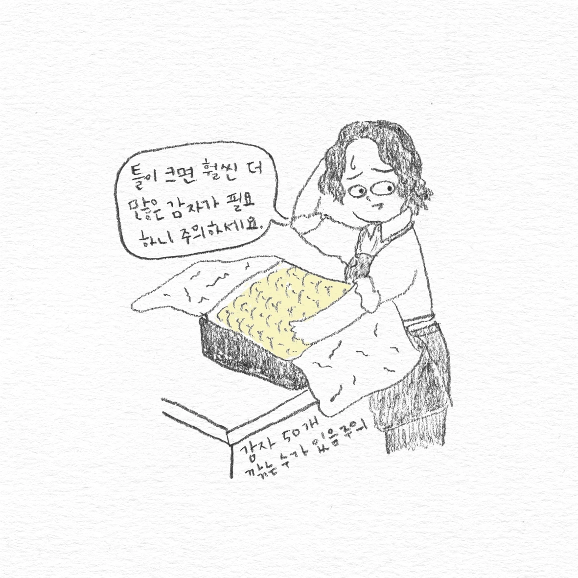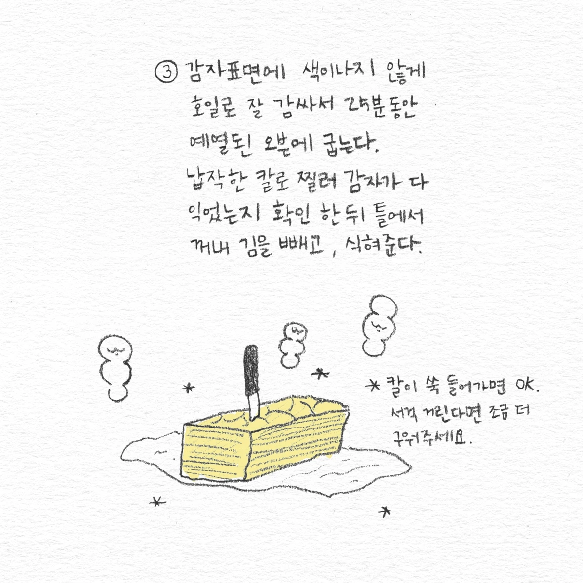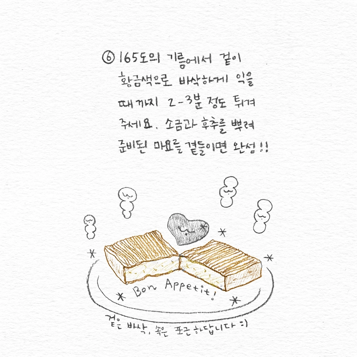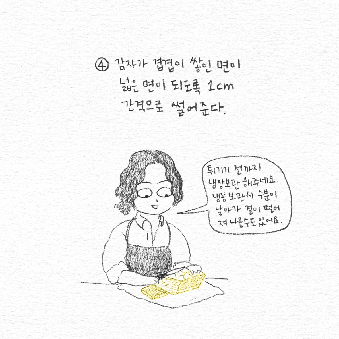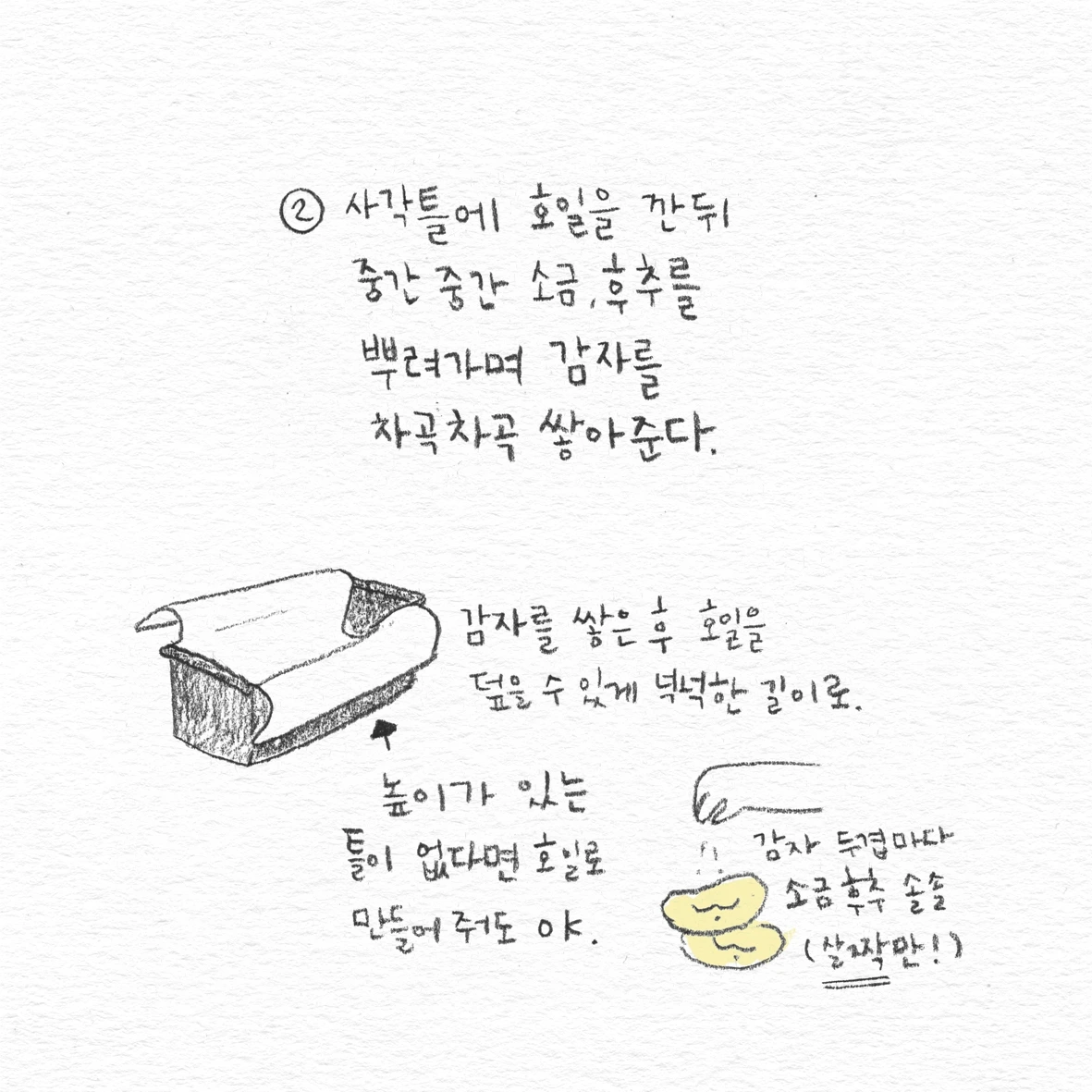 그 중에서 뽐 안나(Pommes Anna)는 감자를 일정한 두께로 썰어 동그란 틀로 찍어낸 뒤 한겹 한겹 버터를 발라 차곡차곡 쌓아서 구워낸 요리이다. 뽐 안나를 색이 나지 않게 구워낸 뒤 뜨거운 기름에 튀겨내면 겉은 감자칩보다 바삭하고 속은 퓨레보다 부드러운 세상에서 가장 근사한 감자 튀김이 된다. 후추를 잔뜩 뿌린 마요네즈나, 마요네즈에 새콤달콤한 발사믹 크림을 더해 섞은 발사믹 마요를 곁들이면 누구나 얼굴가득 웃음이 차오르는 맛을 낸다. 나는 튀긴 뽐 안나에 밀푀유 감자라는 이름을 붙였다.