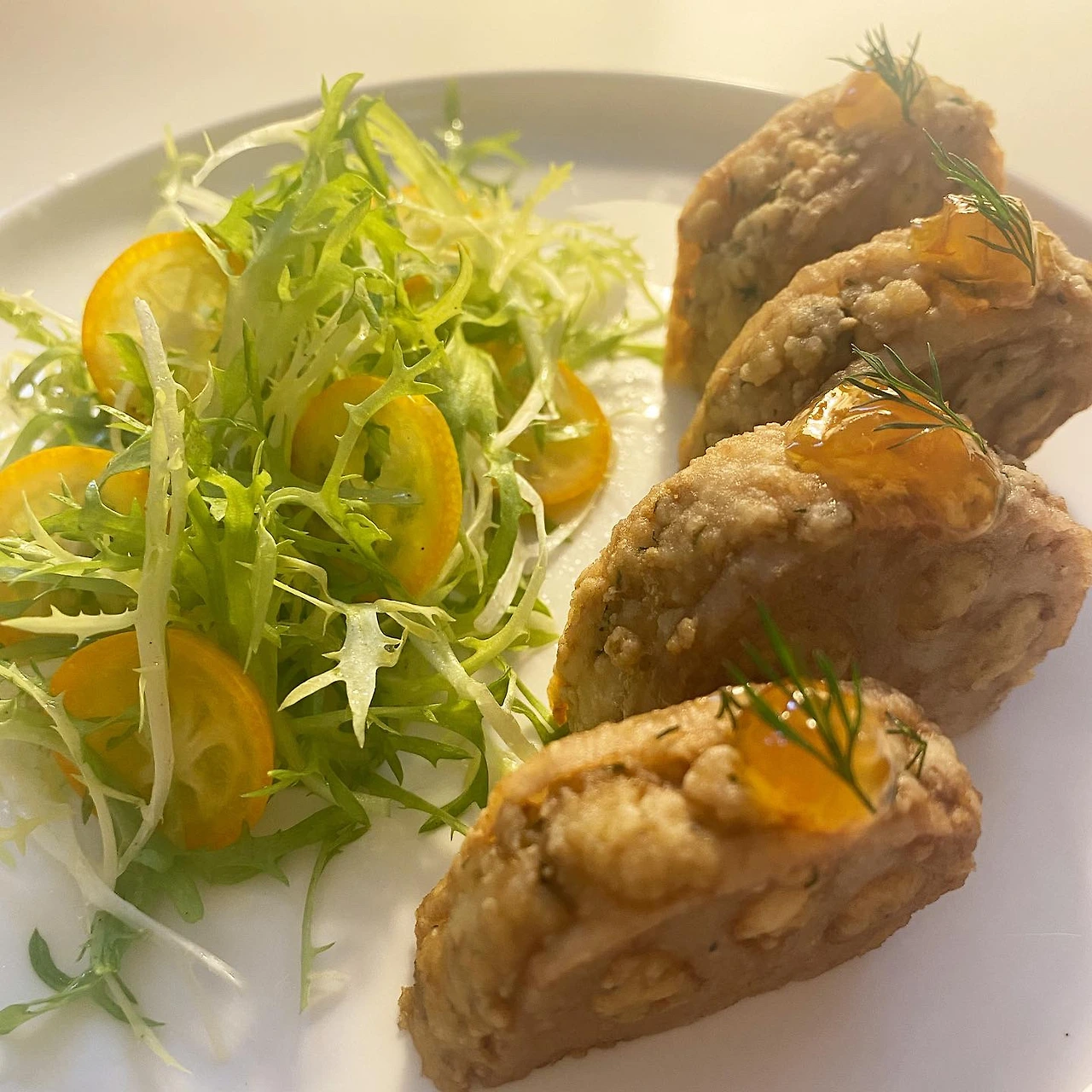 캐주얼한 식당에서 봄의 샐러드로 점심식사를 함께 했다.