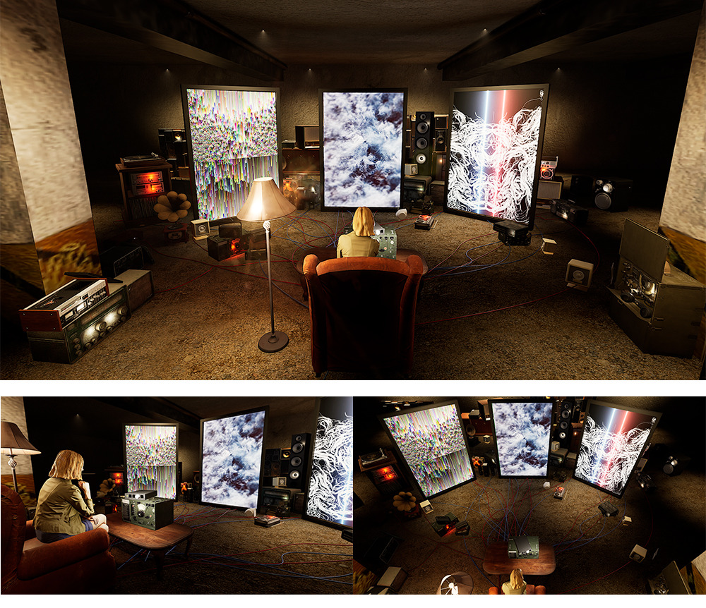 시각적 장치도 중요한 역할을 한다. 공간의 바닥에는 관객이 조작한 다이얼 값에 따라 색이 변화하는 프로젝션이 설치되어 있다. 감정이 부정에 가까울수록 바닥에는 푸른 정맥의 패턴이 나타나고, 긍정에 가까울수록 붉은 동맥의 흐름이 퍼져나간다. 또한 라디오와 스피커를 연결한 전선들은 단순한 기능적 구조가 아니라, 붉은색과 파란색의 배선으로 구성된 ‘감정의 혈관’이다. 이 배선은 기억의 흐름이자 감정의 루트로서, 작품 공간을 유기적으로 연결한다. 관객은 이 시청각적 구조물 속을 직접 걷고, 감정을 따라 이동하는 내적 여정을 경험하게 된다.