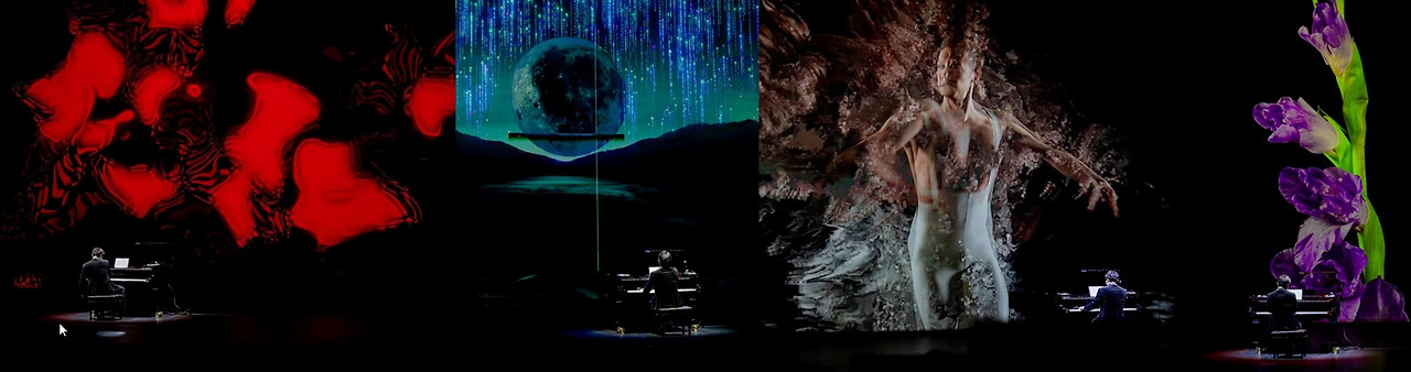 ‘꿈의 궤도’의 오디오 비주얼라이징 작업에서는 세 개의 시각적 채널이 동시에 작동했다. 첫 번째는 Stable Diffusion이 생성한 순수 인공지능 이미지, 두 번째는 피아노의 건반 움직임과 소리 에 반응하는 실시간 인터랙션 영상, 세 번째는 미디어 아티스트가 전체 구조를 해석하고 감정적 리듬을 조율한 예술가 해석 영상이었다. 이 세 채널은 무대에서 동시 투사되며 서로 간섭하고 결 합하면서, 인간의 연주와 인공지능의 반응이 하나의 장면 속에서 공존하는 구조를 완성했다. 특 히 드뷔시의 달빛에서는 음색의 부드러운 흐름과 함께 빛의 질감이 화면에서 자연스럽게 변주되 었고, 메시앙의 불의 섬에서는 불규칙한 리듬과 불협화음의 긴장이 폭발적인 시각적 파동으로 나 타났다. 이는 단순한 시각 효과를 넘어서 음악의 감정을 데이터로 번역하고 다시 이미지로 되돌 리는 순환 구조를 보여주었다.