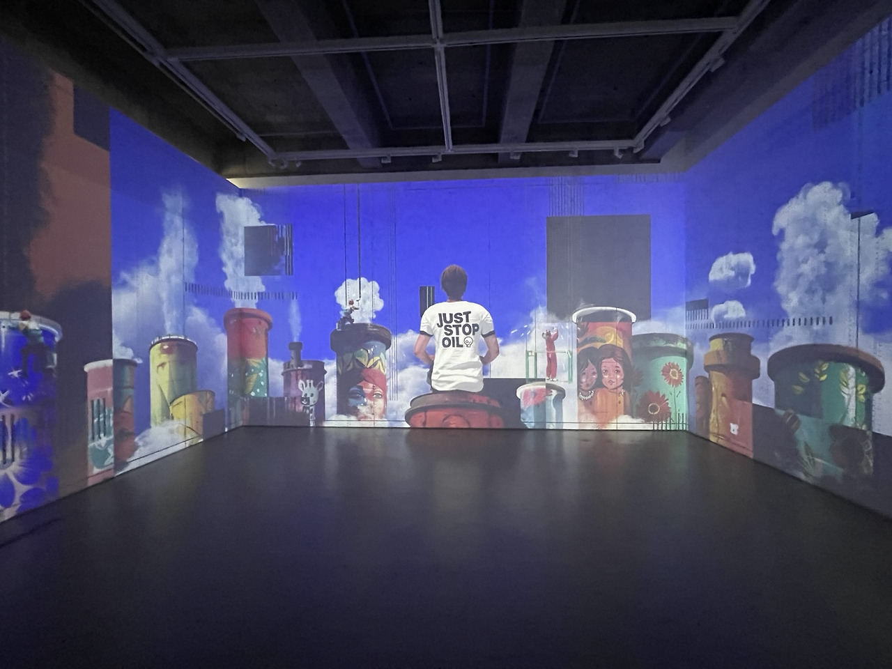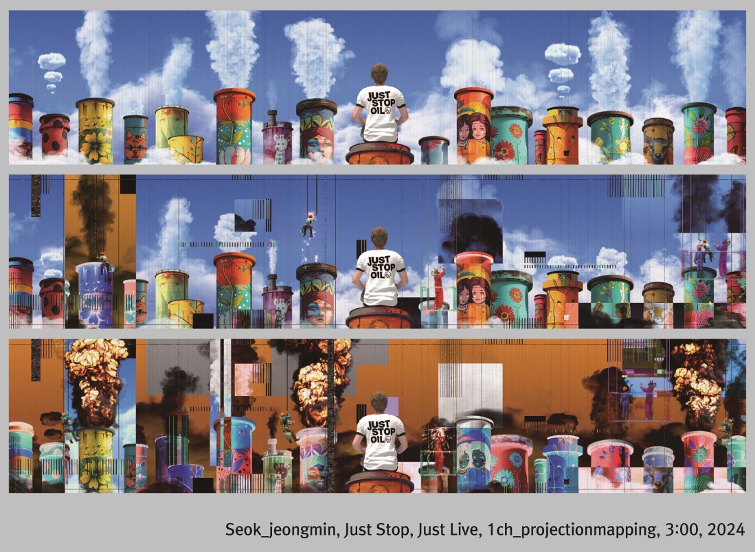 석정민 작가는 2022년 영국의 환경단체 ‘Just Stop Oil’의 행동을 비판적으로 조명한다. 티셔츠에 새겨진 구호, 화면을 깨부수는 남성, 모니터 속의 무력한 복구 장면—이 모두는 환경 문제를 둘러싼 극단적 퍼포먼스가 때로는 그 메시지의 진정성을 훼손할 수 있음을 암시한다. 작가는 모니터 속 세상을 ‘현실’로 상정하며, 그 안에서 벌어지는 훼손과 복구의 장면을 병치시킴으로써, 환경을 파괴하는 인간의 행위와 ‘의미를 위해 문화재를 파괴하는’ 과격한 환경운동 사이의 이중성을 비판적으로 드러낸다.