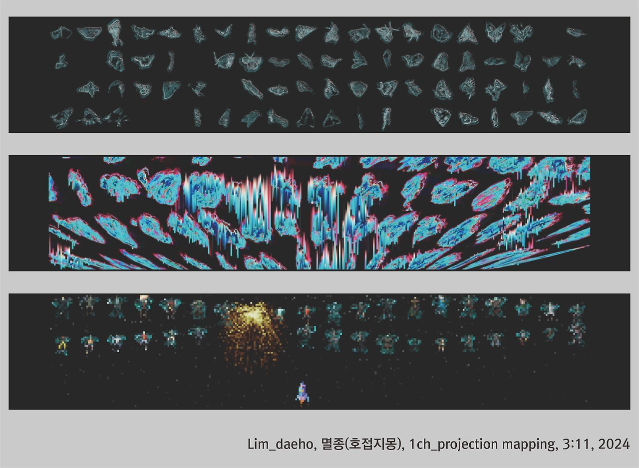임대호의 작품은 시각적 강도를 높이며 직접적인 메시지를 던졌다. 150여 종의 멸종된 나비 표본을 실제 이미지로 편집한 이 작품은, 인간을 멸종한 나비에 비유하며 자연 생태의 경고음을 시청각적으로 울린다. 작품의 구조는 하나의 컴퓨터 시스템처럼 작동하며, ‘갤러그’라는 오래된 아케이드 게임의 형식을 차용해, 인류 문명의 파괴를 놀이처럼 역설적으로 제시했다. 관객은 이 가상의 시스템 안에서 끊임없이 나타났다 사라지는 나비들과 마주하며, 환경 파괴가 더 이상 ‘미래의 예언’이 아닌 ‘진행 중인 현실’임을 직감하게 된다.