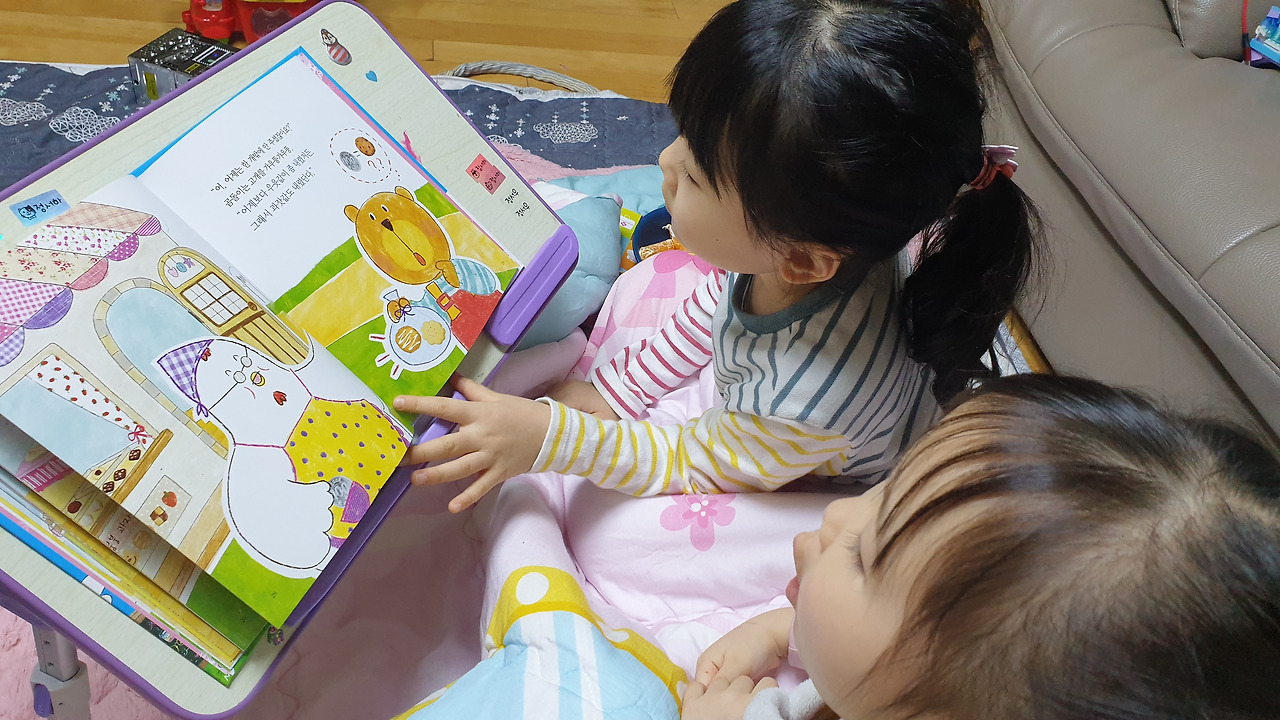 그래서 친정에 보내지 않고, 내가 아이들을 데리고 있기로 했다. 야간 근무 후 잠을 안 자고 아이들을 보는 건 무리다. 웬일로 아침 일찍 눈을 뜬 두 따님들, TV 가 있는 안방으로 모여든다.