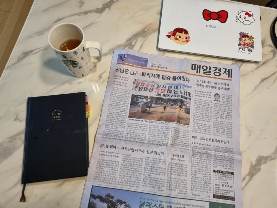 따뜻한 둥굴레차 한 잔과, 매일경제 종이신문, 다 꿈 플래너와, 노트북. 이 얼마 만에 자유인가~