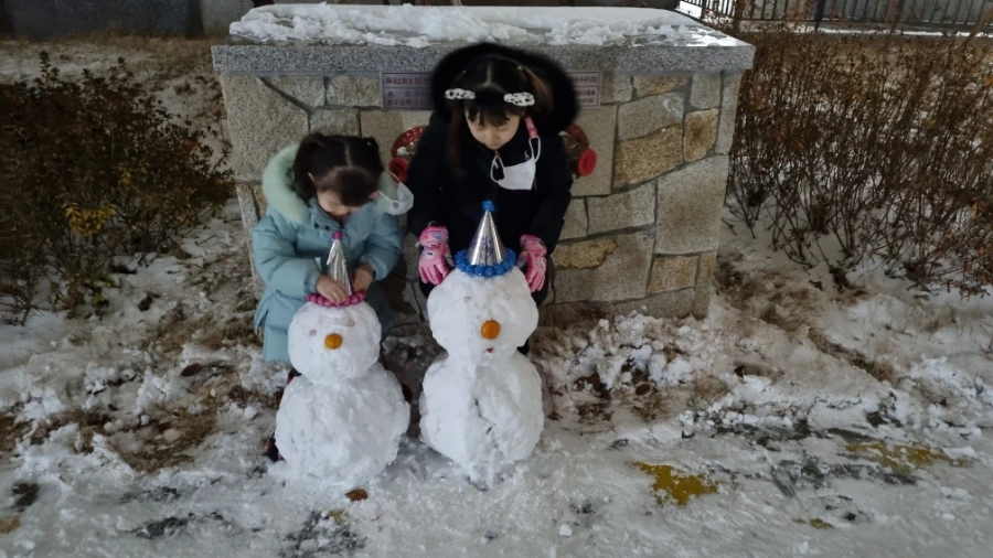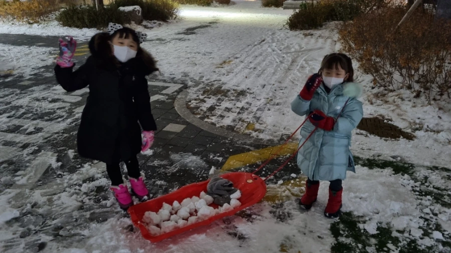 "엄마 장갑 챙겨, 나가자. 눈사람 만들자"