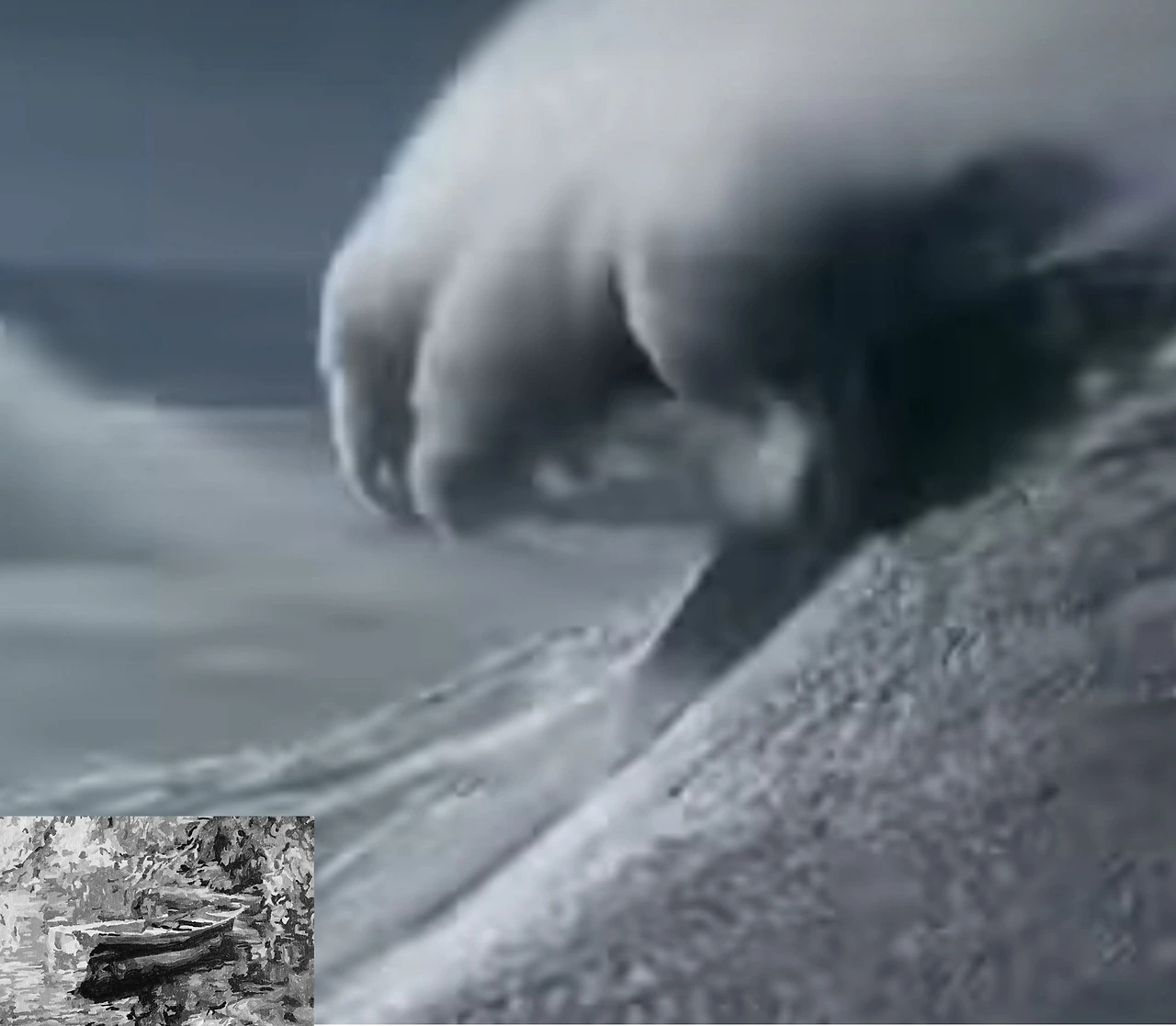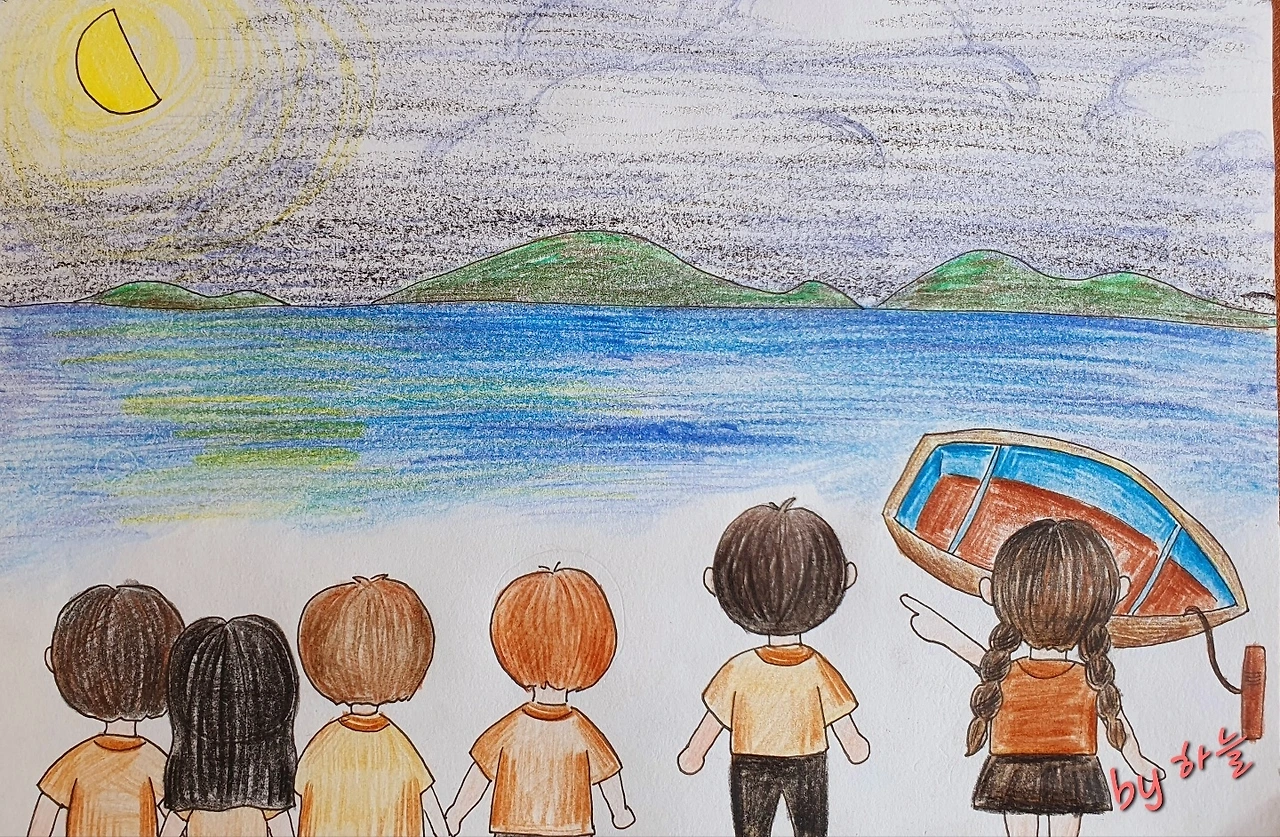 "나룻배가 물속으로 가라앉고 있다. 물을 퍼내어라."라고 하며 반쯤 우는 목소리로 절규했다. 아이들은 모두 고무신이며 나룻배 구석에 나뒹구는 바가지를 들고 물을 퍼내기 시작했다. 그러는 사이 저 멀리서 집채만 한 파도가 나룻배를 삼킬 듯이 밀려오고 있었다. 거인처럼 높은 곳에서 내려다보듯이 머리 위로 덮칠듯한 파도는 하얀 포말을 뿜으며 이글거리는 맹수의 눈빛이 되어 포효했다.
