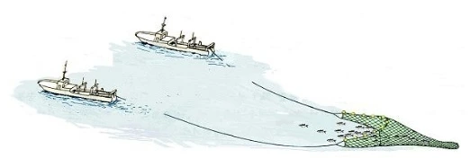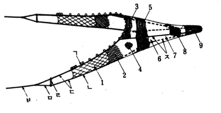 고대구리 쌍끌이 기선저인망 조업도(출처:국립수산과학원)"배에서 그물까지 60~70m 길이의 줄 두 가닥이 30m의 본 그물을 끗고 간다. 본 그물 뒤에는 함정 역할을 하는 불 꼬리[1.5m]가 달려 있다. 주된 특징은 그물을 양쪽으로 넓게 벌려주는 오따(전개판, 1.5 ×4m 내외)가 있으며, 거기에다 길이 40㎝의 개떼(갯대)가 ‘그물을 서서 가게’ 잡아준다. 쉽게 말해서 그물을 위아래로 넓게 벌려서 싹쓸이하는 것이다. '방금 던진 숟가락도 건진다.'라는 우스갯소리가 있을 정도로 밑바닥까지 긁는다."라고 하시며 전문 용어들을 섞어가며 자세하게 설명해주셨다.
