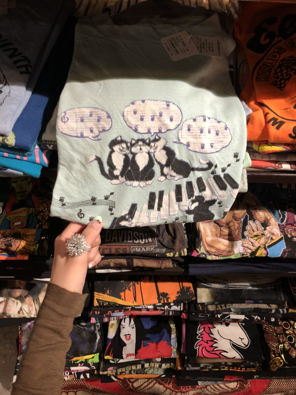 색깔별로 진열된 귀여운 프린팅 셔츠.. 하나하나 다 펼쳐보고 싶은데 직원 눈치 보임ㅋㅋㅋ