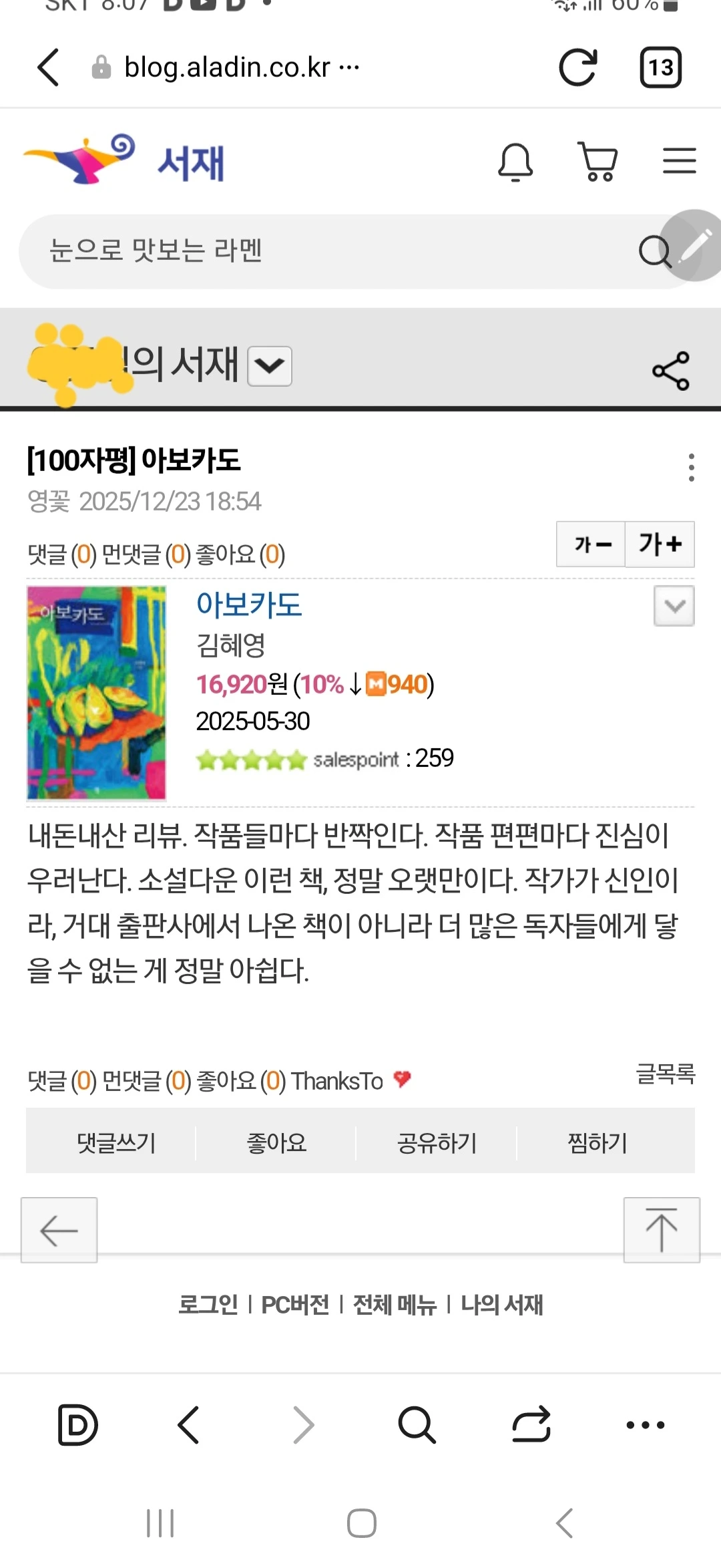 알라딘에 올라온 #소설집_아보카도 리뷰를 보고 빙그레 웃음이 났다.