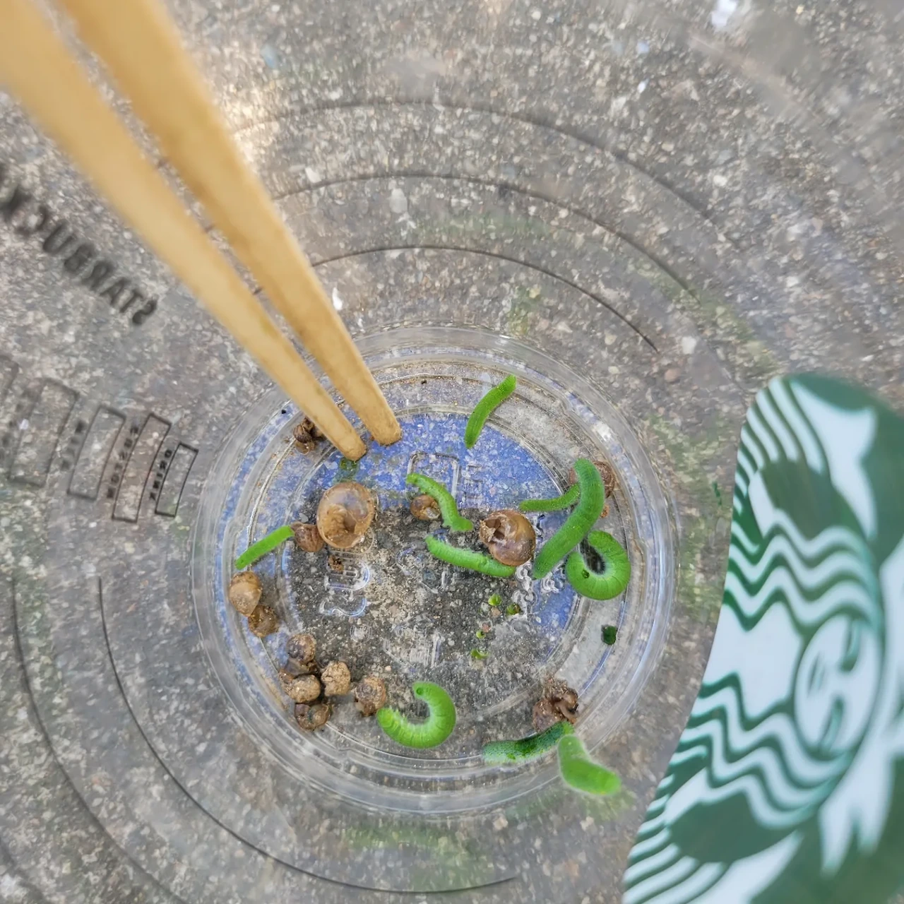 어린 모종을 심고 어느 정도 자라면 그때부터 배추벌레와 달팽이로부터 배추 지키기를 해야 하는데 지금이 한창 그 시기가 됐다. 매일 잡아도 매일 여 보란 듯이 출몰한다. 팥알보다 작은 달팽이들은 땅속에 있다 밤에 활동하는 야행성이란다. 그러니 밤새 배춧잎을 갉아먹고 땅속으로 들어가기 전 잡아줘야 해서 아침 일찍 서둘러야 한다. 배추벌레는 배춧잎 색깔과 비슷해 찾기 힘들다. 할 수 없이 나무젓가락으로 배춧잎 한 장 한 장 헤아리면서 찾아야 한다.