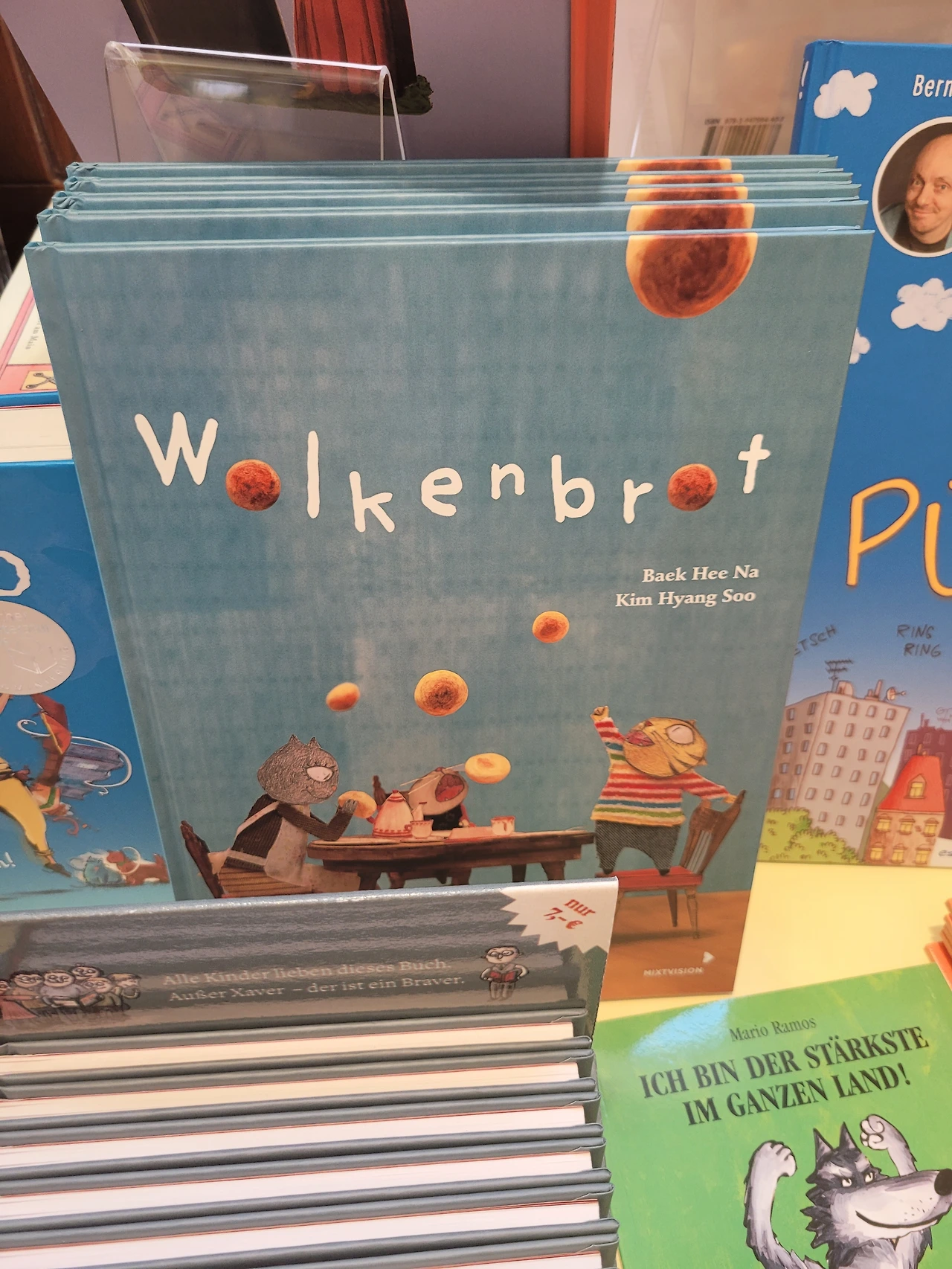 아이들처럼 체험도 하고 다 돌아본 뒤 지성은 책 한 권을 샀다. 독일어 판, 영어 판 한국어판까지 이제 지성에겐 더벅머리 피터 3종이 전부 갖춰졌다. 그리고 거기서 우리 백희나 작가의 구름 빵 책이 꽂혀있는 것을 보았다. 얼마나 반가웠는지 한 번 더 돌아보게 되었다.