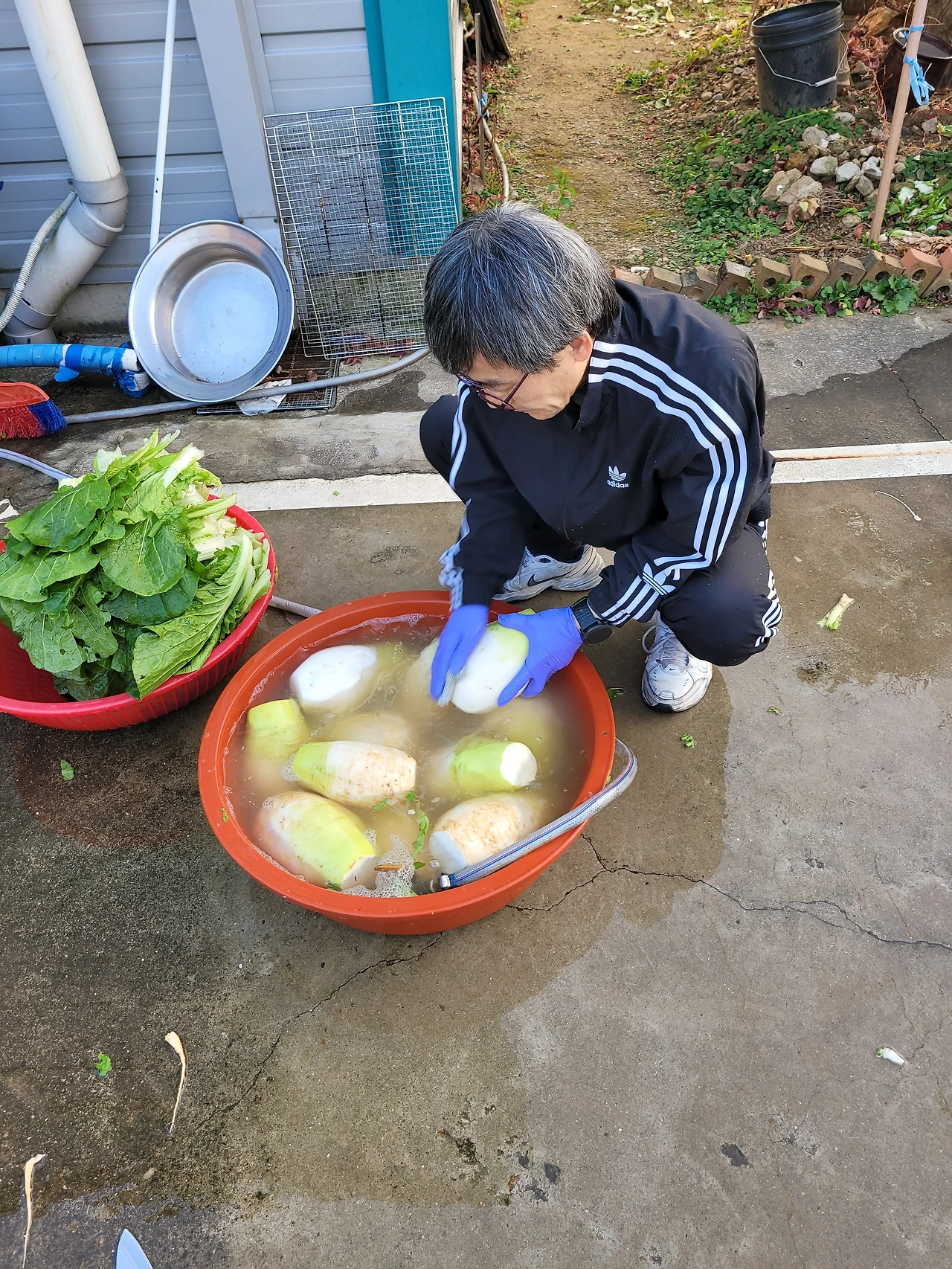 사 먹을 땐 몰랐는데 직접 가꾼 거라 겉잎도 아까워 시래기를 만들었다. 뽑고, 다듬고, 절이고, 그 모든 수고는 남편이 나서서 했다. 그뿐 아니라 부재료를 손질하고 씻고 무를 채 썰고 버무리는 모든 과정 역시 남편이 했다. 하다못해 김장 날 빠질 수 없는 수육까지 남편이 삶았다.