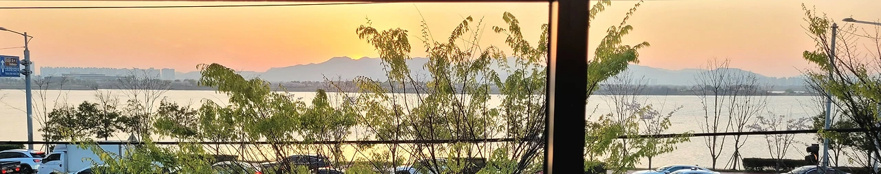 창밖에 기대하던 벚꽃은 없지만 무성한 나뭇가지에 아직 연두색의 어리고 작은 잎사귀들이 있다. 하늘과 비슷한 색의 강이 있다. 멀리 보이는 건너편 뭍의 낮은 숲만이 하늘과 강을 구분 짓는 경계였다.