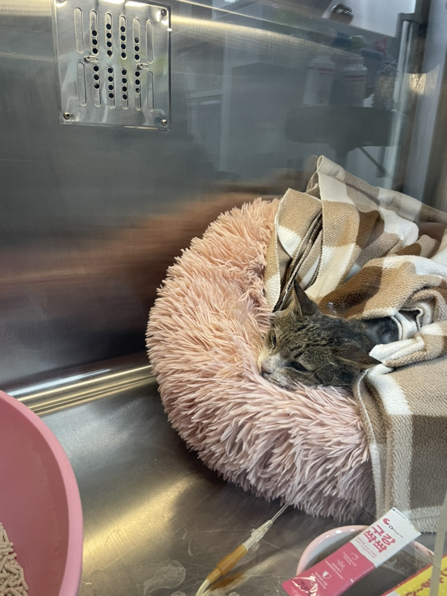회사 운동장 근처 비탈진 곳에 은신처를 마련한 녀석을 발견하고 밥을 건네주던 날. 다리가 이상한 방향으로 꺾인 것 같아 남편에게 어떻게 하지.. 부러진 것 같은데 병원에 데려갈까 하고 물어봤더니 그래야 내 마음이 편할 것 같으면 그러자고 했다. 사실 그 시점에서는 내가 프랑스로 파견 가는 날이 나와있었던지라 고민은 했지만 그냥 돌아서면 두고두고 후회할 것 같아서 퇴근하고 녀석을 잡아 동물병원에 데려갔다.