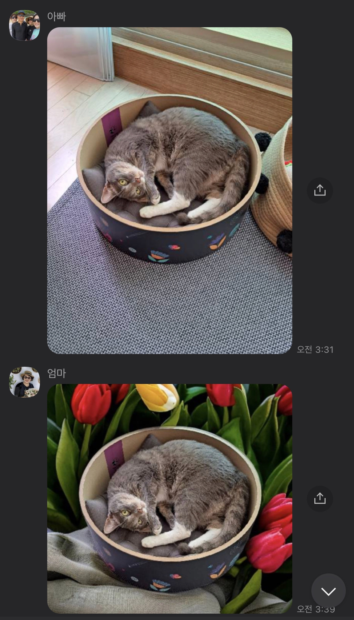 며칠 전에는 엄마가 사진 합성하는 걸 배우셨는지 가족 단톡방에 아빠가 공유한 고양이들 사진을 합성해서 다시 공유해 주셨다. 그러고 보면 단톡방이 온통 고양이 이야기.