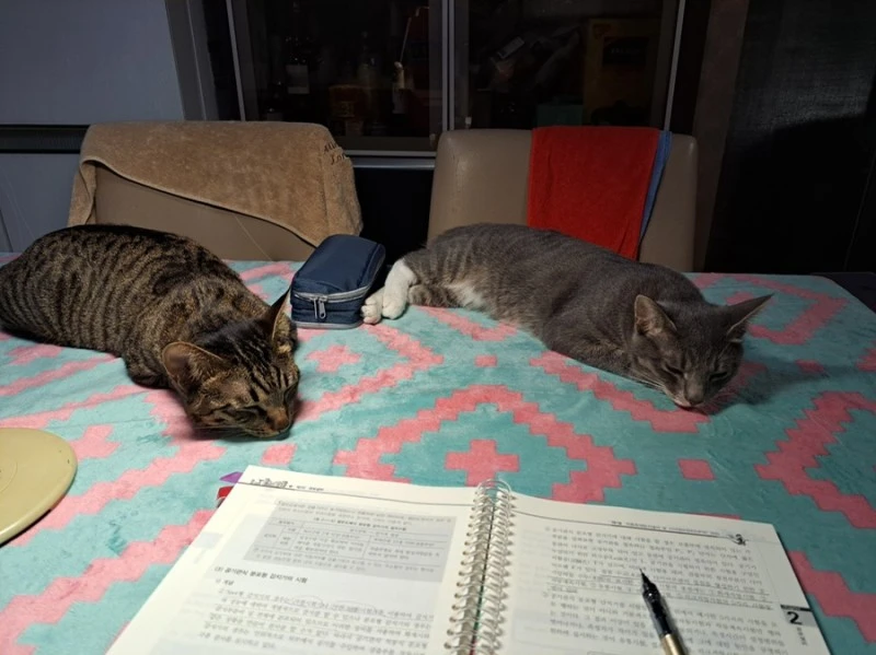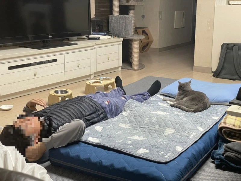“아 느그 아빠가 거실에서 고양이들이랑 같이 잔다고 매트리스 깔았다”