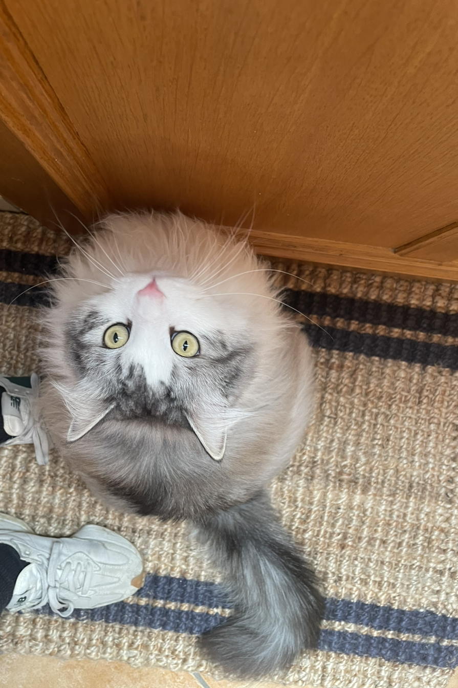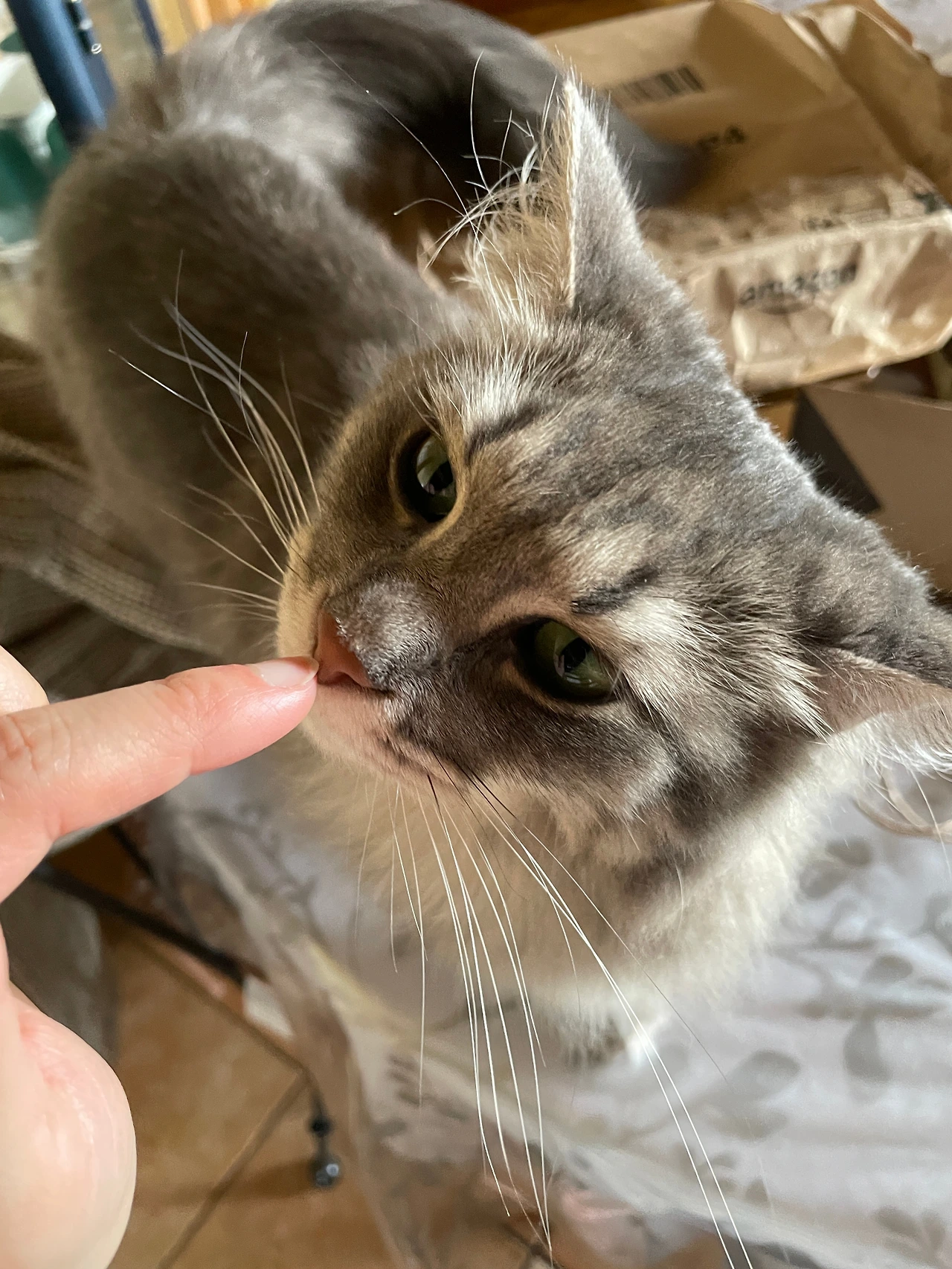 울어도 우리가 일어나지 않으면 침대에 올라와서 남편 옆에 누워있다가 내 위로 걸어 다니면서 재촉하기 시작한다. 모모에 약한 남편은 일어나서 사료를 채워주고 조금 더 버틴 내가 잠시 뒤에 일어나면 어느새 티구가 꼬리로 내 종아리를 감으며 아침인사를 한다. 머리부터 등까지 쓰다듬어 주고 발치에 누운 티구의 엉덩이를 토닥토닥해주면 우리의 아침 의식이 끝난다.