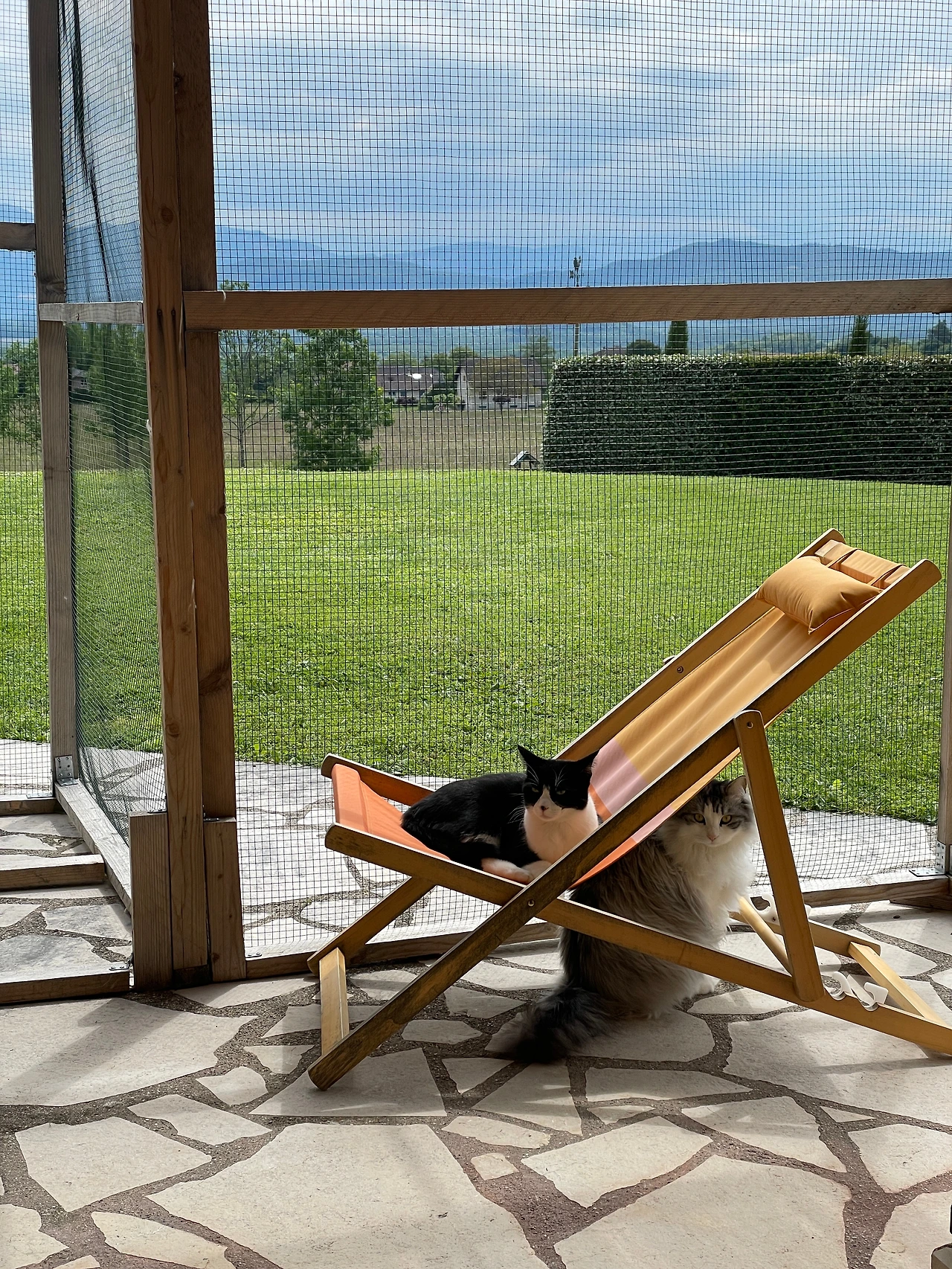 비행기를 타고 한 시간만 가면 유럽 어디라도 갈 수 있지만 고양이와 함께라 집에서 보내는 시간이 더 좋은 우리. 우리가 사는 집은 마당이 탁 트여 있어서 요즘같이 날씨가 좋을 때는 마당에 나가서 맥주만 마셔도 힐링인 것. 아무래도 어른 둘이 캣티오 안에 들어가 있으면 답답해서 종종 집 앞에 선베드를 내놓고 앉아있는데 그러고 있으면 고양이들이 캣티오에 매달려서 우릴 보며 울고 난리다. 마음이 급해진 사람이 먼저 들어가는 수밖에..