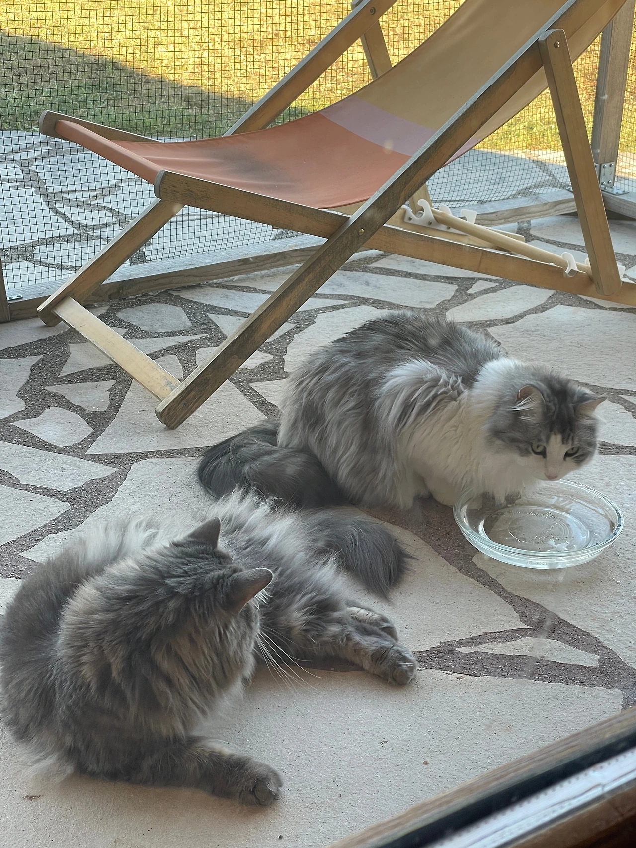 털코트를 야무지게 껴입은 우리 고양이들은 이 더운 날에도 캣티오에 나가고 싶어서 애옹 애옹. 한 번 문을 열 때마다 뜨거운 바람이 집안으로 들어오는지라 어지간하면 문을 열어주지 않는데 하도 나가고 싶어 해서 어제는 애들만 내보내고 문을 닫았더니 그래도 좋다고 바닥에 누워 있었다. 남들이 보면 동물 학대하는 줄 알겠네. 학대당하는 건 집사들.. 그래도 더울까 봐 얼음물도 대령해 줌.