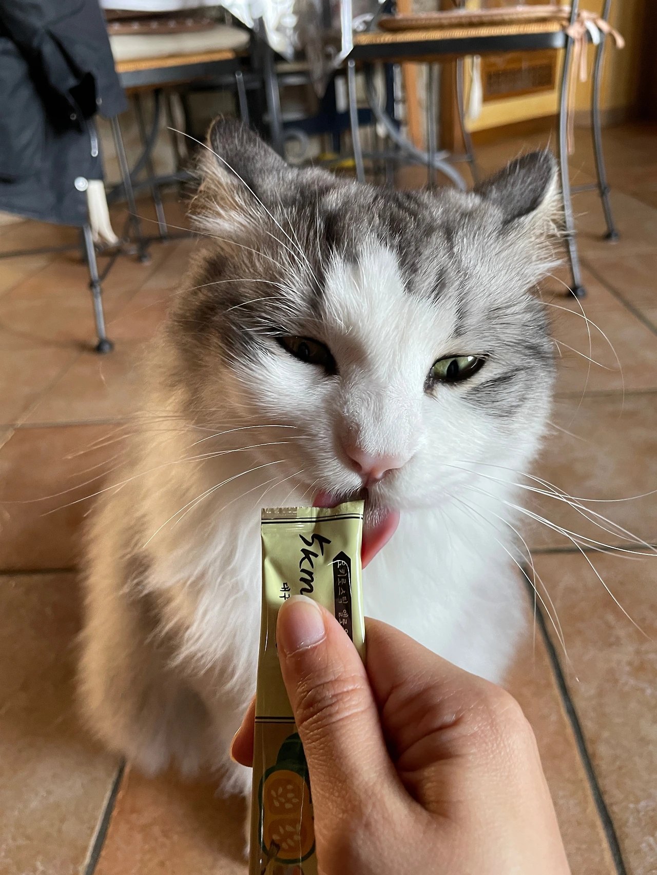 알약이 작아서 간식에 섞어 주니 뭔지도 모르고 날름 받아먹는 녀석. 우리 집은 매일 오후 5시쯤 고양이들에게 다 간식을 주는데 모모가 수상한 낌새를 알아챌 수 없게 토요일 간식시간에 모모 간식에만 알약은 톡 넣었다. 나 좀 천재인 듯. (고양이를 상대로 이렇게까지 머리를 쥐어짜야 하다니)