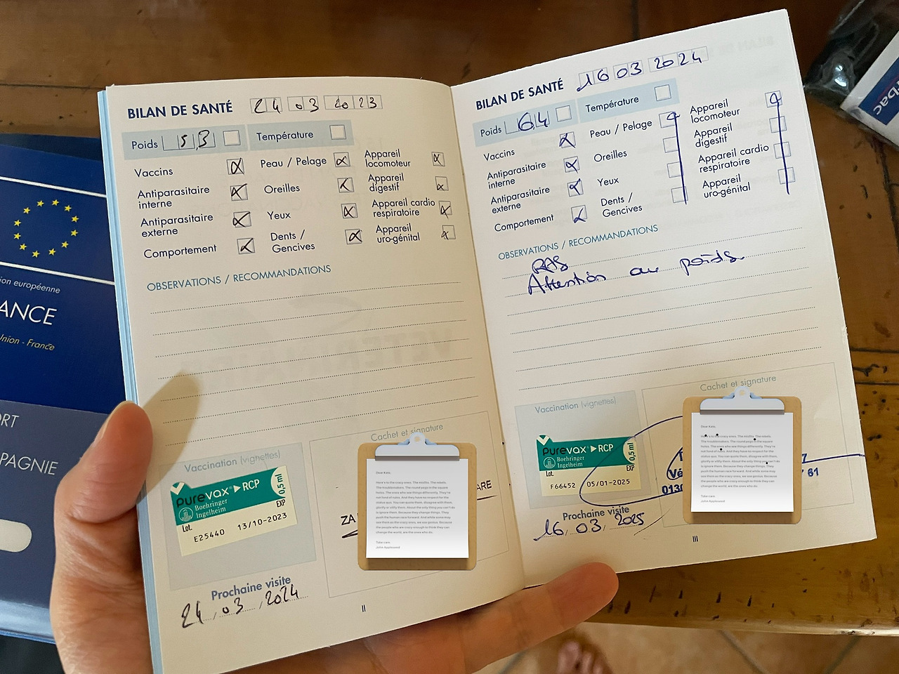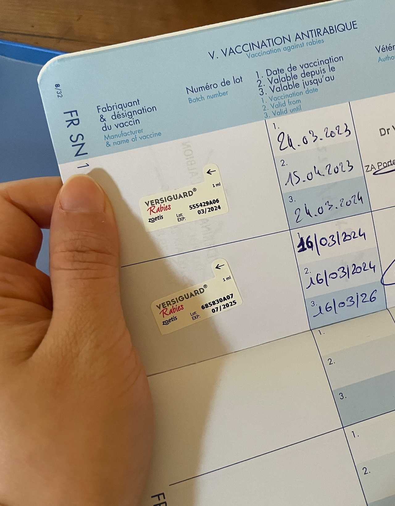 프랑스에서 동물 등록을 하고 동물병원에 가서 여권을 만들어 달라고 하면 만들어 준다. 기본적으로 반려 동물의 마이크로칩 번호, 외모에 대한 묘사(사진도 넣을 수 있다)와 소유주에 대한 정보가 들어가 있는데 매년 종합 백신 접종을 하고 접종한 날짜와 유효기간, 그리고 접종한 병원/수의사 정보를 기록한다.