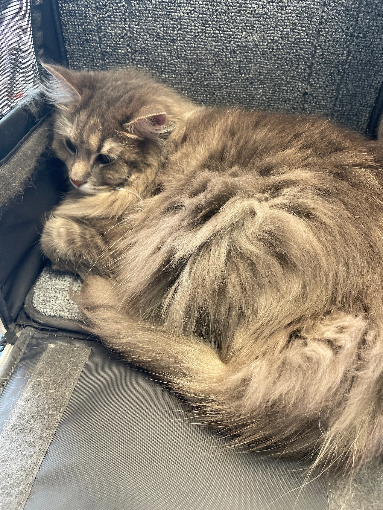 결국 남편이 모모 이동장을 무릎에 올리고 지퍼를 좀 열어서 모모가 밖을 볼 수 있게 해 주었다. 숨을 가쁘게 쉬긴 했지만 울지는 않았다. 어떤 방법이 좋은지는 여전히 모르겠다.