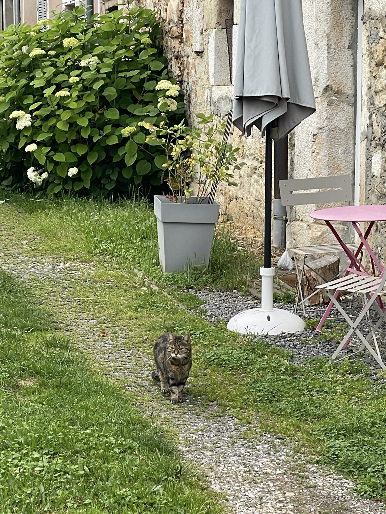 우리가 이사 온 뒤로 우리 마당에 정기적으로 마실을 오는 이 까만 고양이는 장모라 길고양이 같지는 않지만 이 동네 여기저기서 마주친 적이 있어서 산책을 좀 멀리 다니는 고양이인가 했는데 딱히 집은 없는 것 같다. 보통은 우리가 가까이 가면 멀찌감치 도망치는 편인데 (우리 집 마당에 둔 의자에서는 종종 자는 듯) 하루는 좀 절뚝거리는 것 같아서 가까이 가보니 발이며 양쪽 목에 물린 상처가 있었다. 근데 또 목 근처 털이 밀려있는 것으로 봐서 동물병원에서 처치는 된 것 같았다.