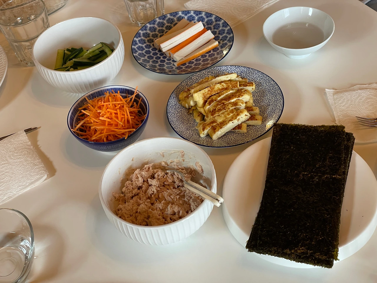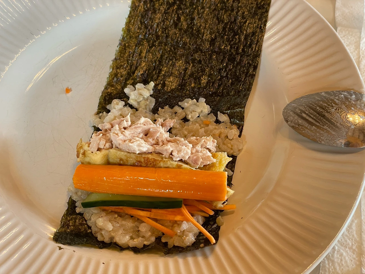 하필이면 여름휴가 전에 밥솥이 고장 나서 현미쌀로 솥밥을 한 다음 김밥도 셀프로 싸 먹기로 했다. 요즘 북미에서는 LA김밥이 유행한다던데 각자 먹고 싶은 것 싸 먹기. 사실 밥을 더하고 라이스페이퍼를 김으로 바꿨다 뿐이지 첫째 날 월남쌈이랑 흡사함.