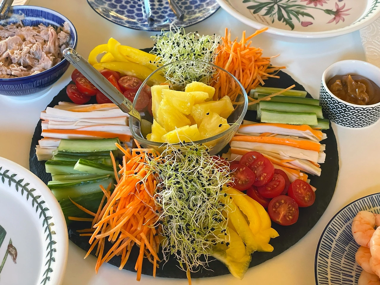 월남쌈을 한식..이라고 하기는 어렵지만 시작은 월남쌈이었다. 하필 시어머니가 방문했을 땐 30-35도를 왔다 갔다 하는 더운 주였고 문제는 우리 집에 에어컨이 없어서 밥이고 나발이고 인덕션을 틀기도 싫었다. 불 안 쓰고 뭘 해 먹을까.. 고민하다가 마침 집에 비상용으로 구비한 라이스페이퍼가 생각나서 냉장고에 있는 것 싹 털고 새우만 더 사서 월남쌈을 해 먹었다.