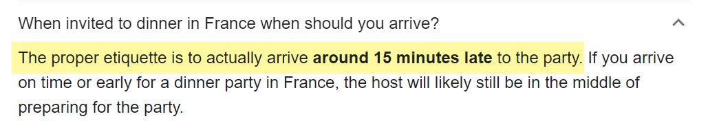 프랑스에서는 초대를 받으면 15분 정도 늦게 도착하는 것이 에티켓이라는 것이 아닌가! 정시에 가거나 일찍 도착하는 건 무례한거라고. 호스트가 준비하느라 늦을 수 있으니 준비할 시간을 넉넉히 주라는 것이 요지였다. 아니 늦을 것을 예상해서 더 빨리 준비를 시작해야 되는거 아니고?