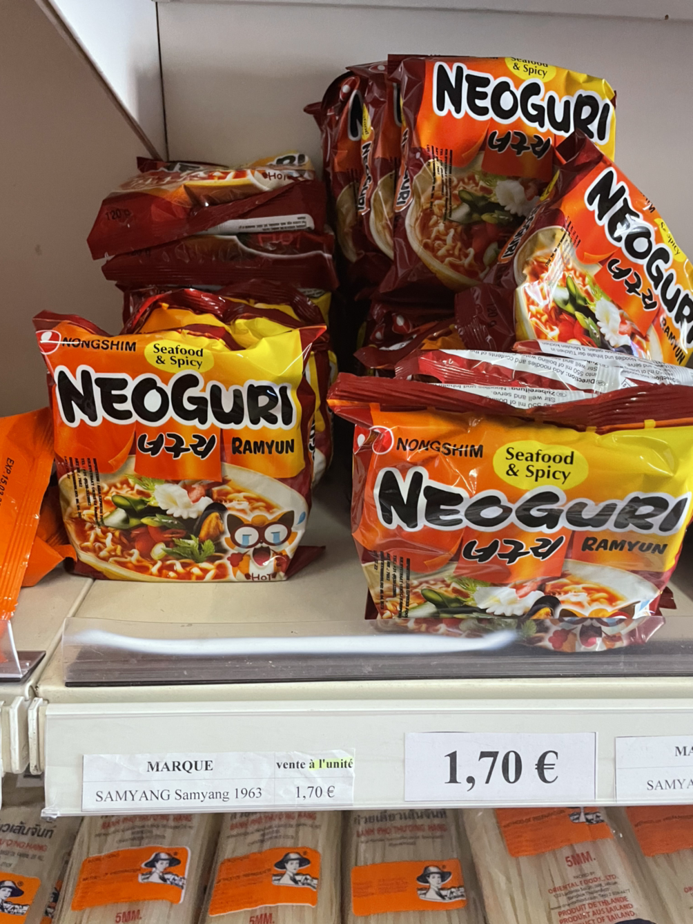 그리고 라면 코너에서 내가 가장 좋아하는 너구리와 짜파게티를 찾았다. 불닭볶음면은 아예 팩으로 팔고 있었는데 그렇게 매운 건 우리는 잘 못 먹어서 프랑스에서 잘 팔리나 보나 신기하다 하고 패스했다. 떡국떡이랑 라면이랑 냉동만두랑 이것저것 샀더니 120유로 정도 나왔는데 한동안 비상식량으로 요긴하게 먹을 수 있을 것 같다.
