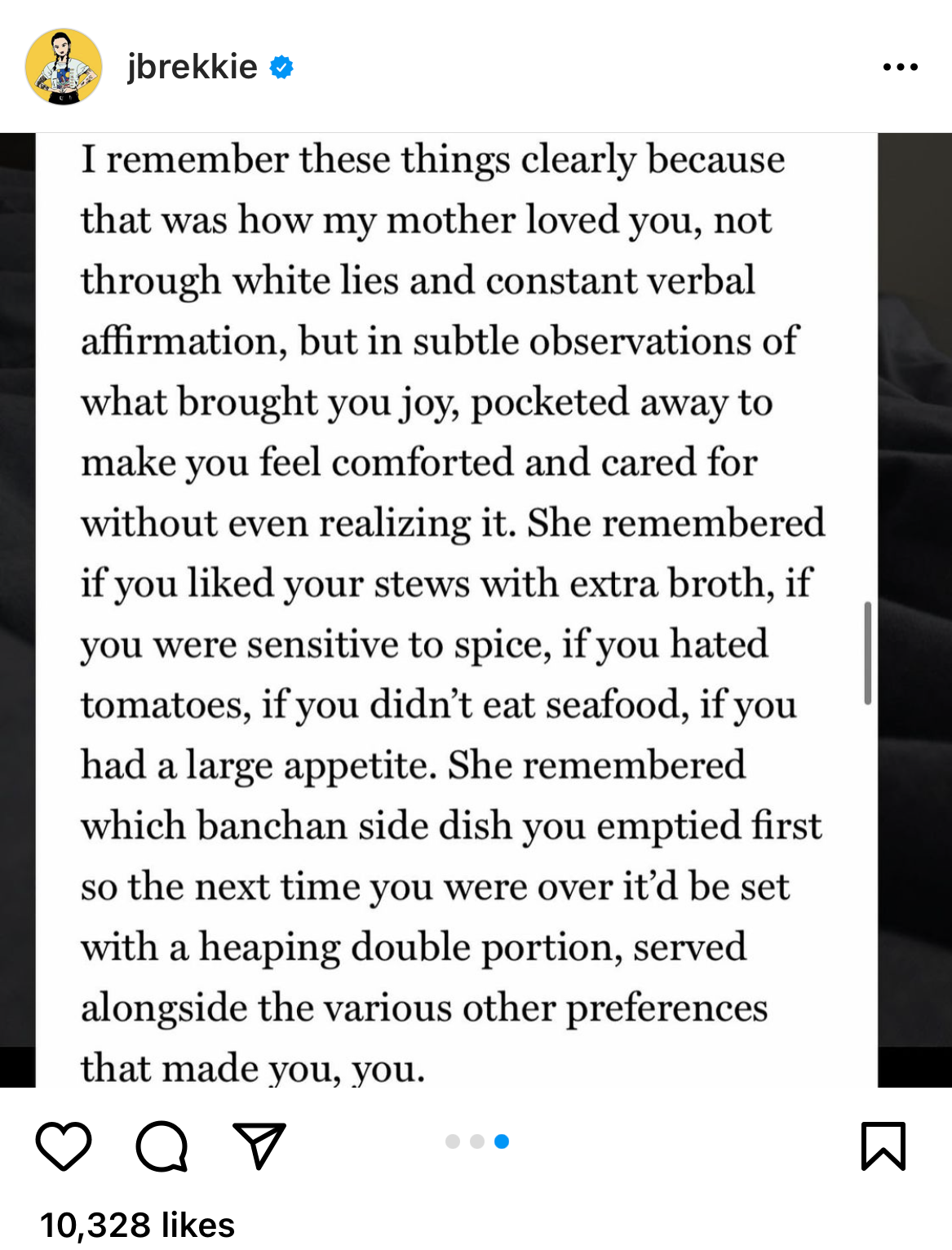 전체적으로 묘사가 굉장히 잘 된 에세이라 읽으면서 눈물도 많이 났고 동시에 엄마가 해 준 밥이 엄청 먹고 싶었다. 돼지고기 목살을 많이 넣고 걸쭉하게 끓인 김치찌개나 청양고추를 넣고 매콤하게 끓인 된장찌개, 무를 큼직하게 썰어 넣은 고등어조림, 굴소스로 맛을 낸 소고기와 버섯볶음 같은 것들.