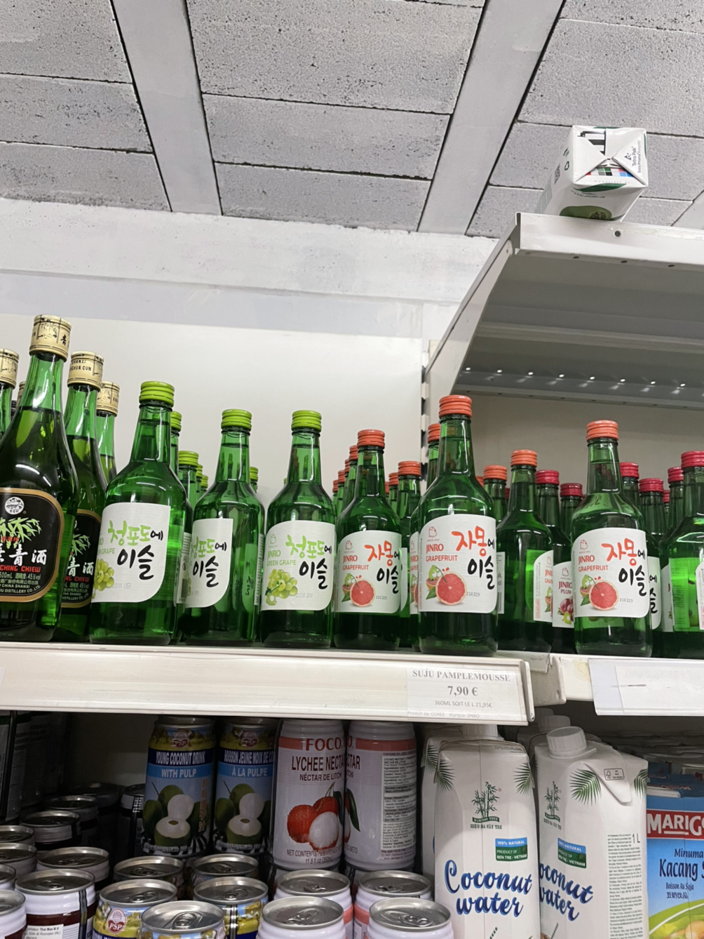 어찌 된 일인지 일반 소주는 없고 과일맛이 나는 소주만 있었는데 남편이 좋다고 주워 담다가 가격표를 보더니 7.90€.. 소주 한 병에 만원이나 주고는 못 사겠다며 다시 내려놓았다. 와인도 한 병에 10유로 안 하는 경우가 많은데 소주 가격 너무 한 거 아니냐며. 어차피 소주 좋아하는 것도 아닌데 뭘 그래. 프랑스 있는 동안은 와인이나 마시자.