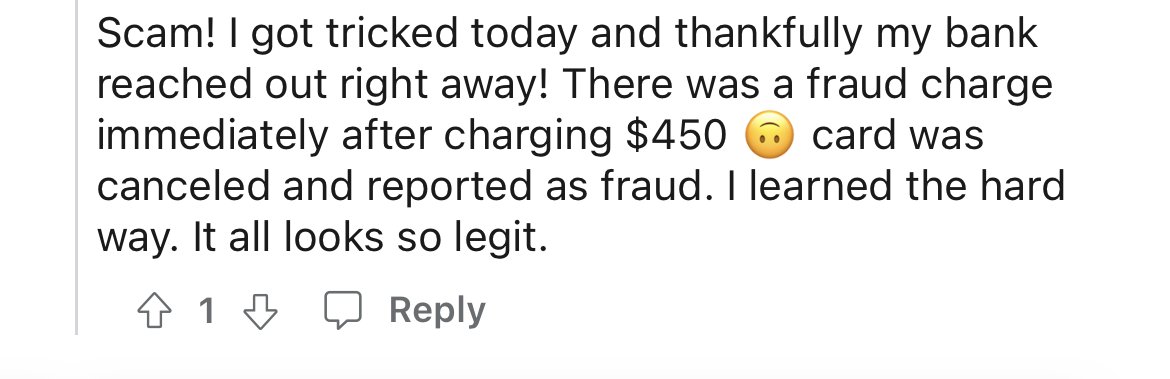 찾아보니 나처럼 스캠 당해서 카드번호까지 홀랑 알려준 사람이 또 있었네.. 이 댓글 보고 기겁해서 은행 긴급전화로 대금지급 중지 요청을 하고 카드도 취소한 뒤 재발급 신고를 했다. 의외로 토요일 새벽 1시에 긴급 라인 전화받는 사람이 있다는 것에 놀람.