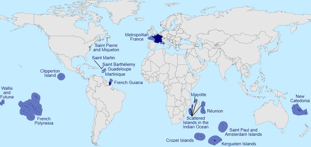 프랑스 영토는 유럽뿐만 아니라 모든 대륙에 영토가 있다. 유럽에 있는 프랑스와 해외영토. 해외영토도 프랑스라 같은 법이 적용됨 (예외 있음).