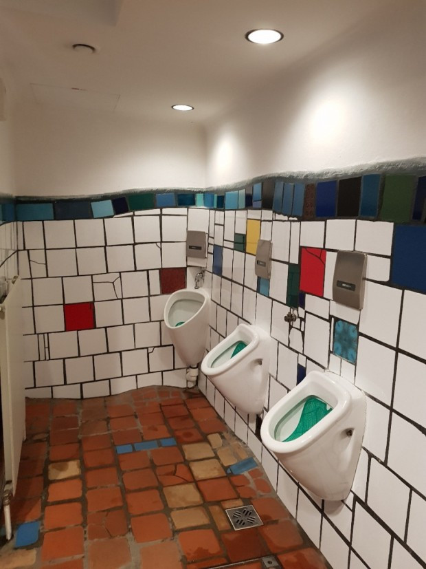 이 밖에도 쿤스트하우스 비엔나의 훈데르트바서 미술관에서도 그의 흔적을 찾아볼 수 있어. 특히 화장실이 유명한데, 크기가 제각 기인 수많은 타일로 이루어진 내부 벽면과 부드러운 곡선으로 처리된 모서리 부분 등이 눈길을 끌지. 흰색을 기본으로 다양한 색깔의 타일을 이용해 흔히 사용하는 화장실이 아닌 색다른 공간으로 재탄생했어.
