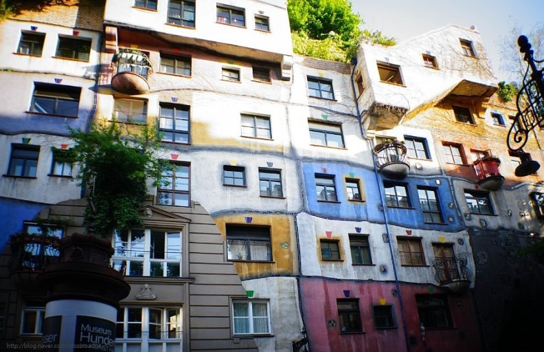오스트리아 비엔나는 모차르트와 베토벤 같은 음악 거장들의 흔적으로 가득하지. 클림트와 에곤 쉴레의 흔적들도 거리에 넘쳐난단다. 하지만 아빠는 이 유명한 한 명의 건축가 덕분에 비엔나가 과거에만 머무르지 않고 현대와 공존할 수 있는 도시가 되었다고 생각해. 그의 이름은 프리덴슈라이히 훈데르트바서야.(이하 훈데르트바서) 이 아저씨는 1928년 비엔나에서 태어났는데 유대인인 홀어머니 밑에서 자랐고, 2차 세계대전 중 히틀러의 유대인 탄압을 직접 경험한 것으로 유명해. 이때의 경험은 그를 평화주의자로 만들었고, 지금의 이름인 프리덴슈라이히 훈데르트 바 서라는 이름도 그가 직접 지은 이름인데 독일어로 '평화롭고 풍요로운 곳에 흐르는 백개의 강'이라는 뜻이란다. 어려서부터 색채와 형태에 대한 남다른 감각을 가졌던 그는 전쟁이 끝난 뒤 비엔나 미술아카데미에 잠시 몸담기도 했지만, 이후에는 유럽 전 지역을 여행하며 독자적인 예술 세계를 구축하기 시작했어. 그는 작업실을 따로 두지 않았고, 야외 레스토랑, 기차, 비행기 등 본인이 있는 곳이 바로 작업실일 정도였어. 종이와 캔버스는 물론 포장지, 천조각, 버려진 종이 등 그가 손을 대는 곳은 곧바로 하나의 예술 작품이 되어버렸지. 특히 그가 집착한 것은 나선 형태였는데, "시작과 끝이 정해져 있지 않고 끝없이 돌고 도는 나선은 우리의 삶과 가장 많이 닮아 있다"라고 말한 것처럼 생명과 죽음을 상징하는 형태이 인 나선 형태의 작품들이 많았어. 특히 그는 색채를 조합하는데 탁월한 감각이 있었고, 평론가들은 그를 '색채의 마술사'라고 불렀어.
