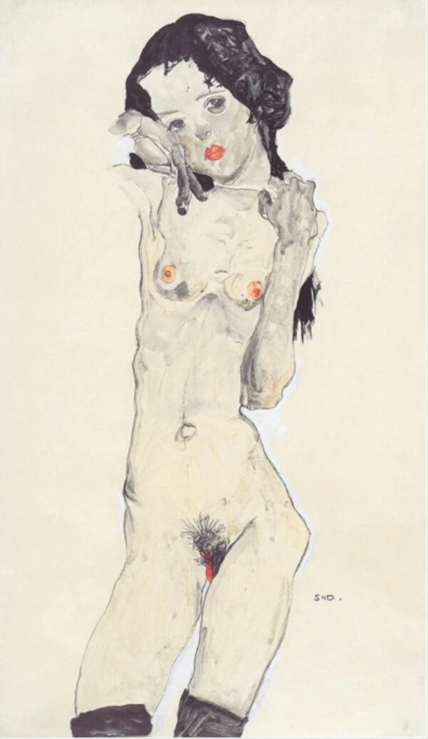 클림트와 떼어 놓을 수 없는 인연의 화가이자, 클림트만큼이나 현대 미술계에서 가장 인기 있는 화가 중 한 명인 에곤 쉴레. 초기에는 스승 클림트의 영향으로 화려하고 장식적인 양식을 선호했지만, 점차 에로티시즘을 주제로 인간을 거칠게 표현하는 독자적인 스타일을 만들어갔어. 그가 살던 시절의 오스트리아 비엔나는 유럽 최고의 환락가였어. 그러나 비엔나는 표면적으로는 아직도 성(性)에 관해서는 아직 보수적이었지. 더군다나 여성의 성은 금기사항이었는데, 그는 성이 인간의 본질을 가장 솔직하게 드러낼 도구라고 여겨서 과감하게도 작품의 주제를 성으로 선택했다고 해. 조금 어려운 이야기지? 우주가 조금 더 나이가 들면 더 이해하기 쉬울 텐데, 그래도 최대한 이해하기 쉽게 아빠가 설명해 줄게. 쉴레는 남녀의 성기, 매춘부, 성직자 등 현대에서도 받아들이기 힘든 소재를 적나라한 묘사와 함께 거리낌 없이 누드로 그릴 수 있었어어. 하지만 누드 자체를 그렸다기보다는 사람의 본질을 관찰하고 예술을 탐구한 것이었어.