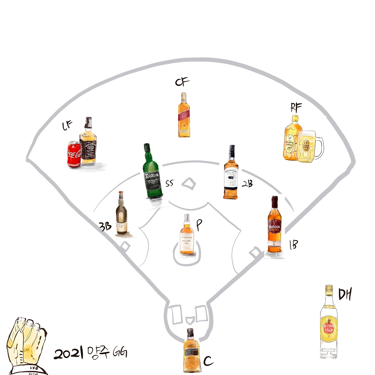 타자가 치는 가장 빠른 공이 총알처럼 날아오는 3루는 그 강렬함 만큼이나 라가불린12가 잘 어울린다. 강한 어깨를 가지고 있어야 하는 유격수는 이 술이 떠올랐다. 강렬함을 가진 바이킹의 술, 아드벡10이다. 처음에 열면 아일라의 술이 쉽지 않다는 걸 소독약 냄새 같은 첫 향으로 느낄 수 있다. 하지만 시간이 지나면서 잊히지 않는 술이 되었다. 부드럽고 센스가 필요한 2루에는 젠틀한 맛이 있는 보모어12가 괜찮지 않을까 싶었다. 내야의 왼쪽 3개의 술이 다 아일라의 술이라 1루는 뭔가 다른 지역의 술이 필요했다. 견제구를 잡다가 공을 빠뜨리는 일이 없어야 하는 안정적인 존재. 글렌피딕 15년 솔레라가 괜찮지 않을까?