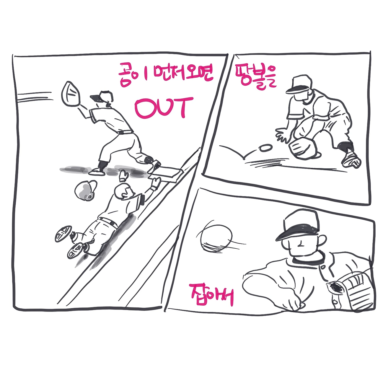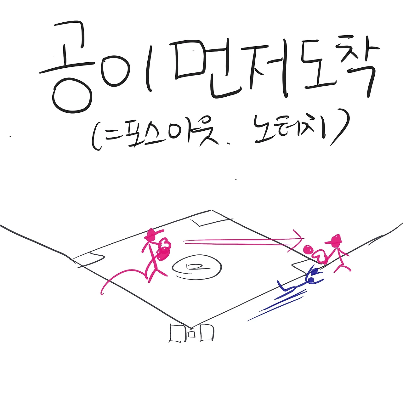 주자가 가야만 하는 베이스에 공이 먼저 도착하는 경우. 아웃!