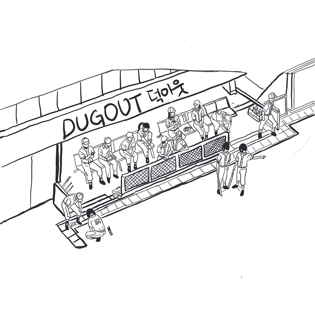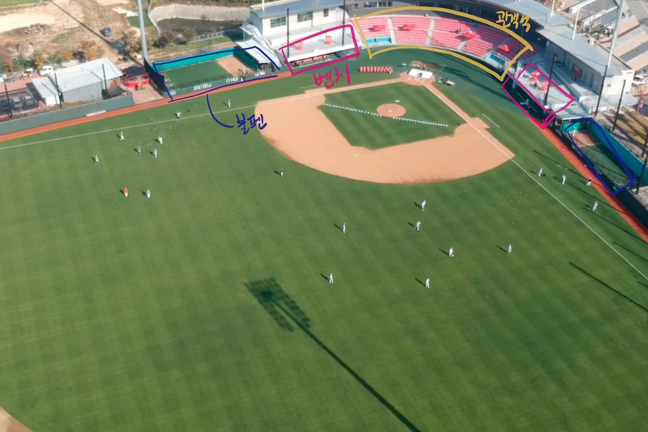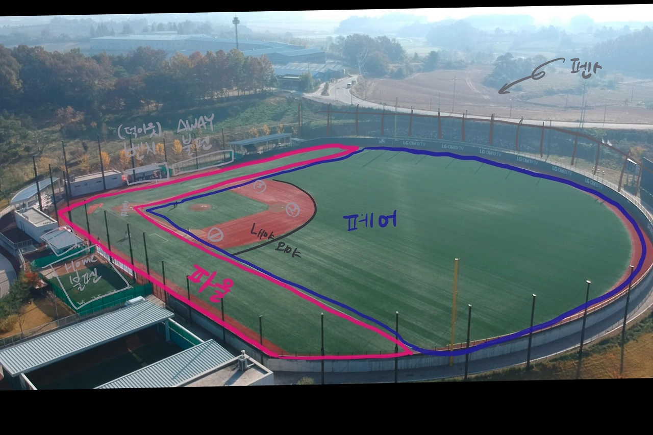 핑크색 부분이 벤치, 그리고 파란색 부분이 불펜입니다.