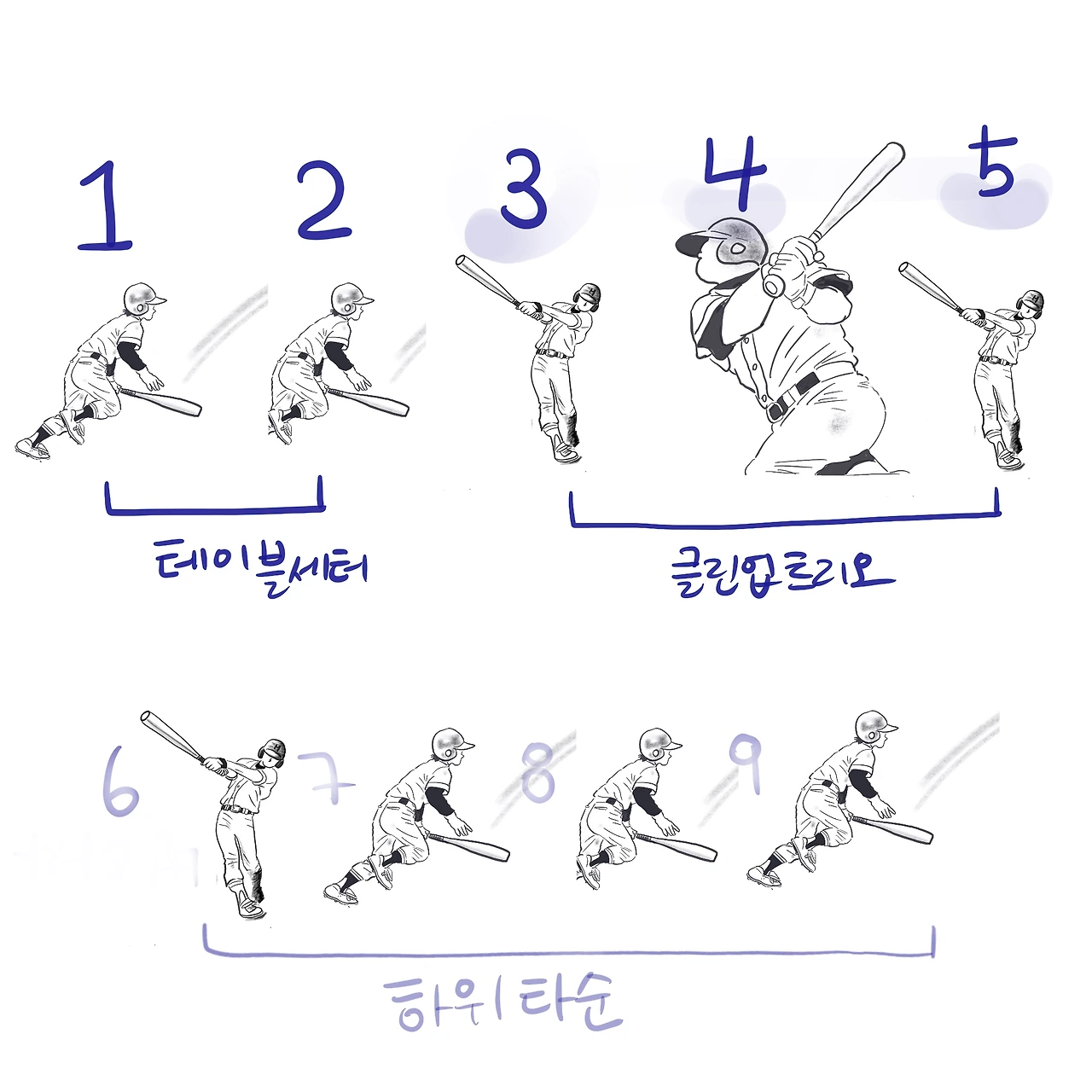 1-2번 테이블 세터 : 밥상을 차리는 사람들. 잘 치고, 루상에 여튼 올라 오는 빠른 선수들이 많음.