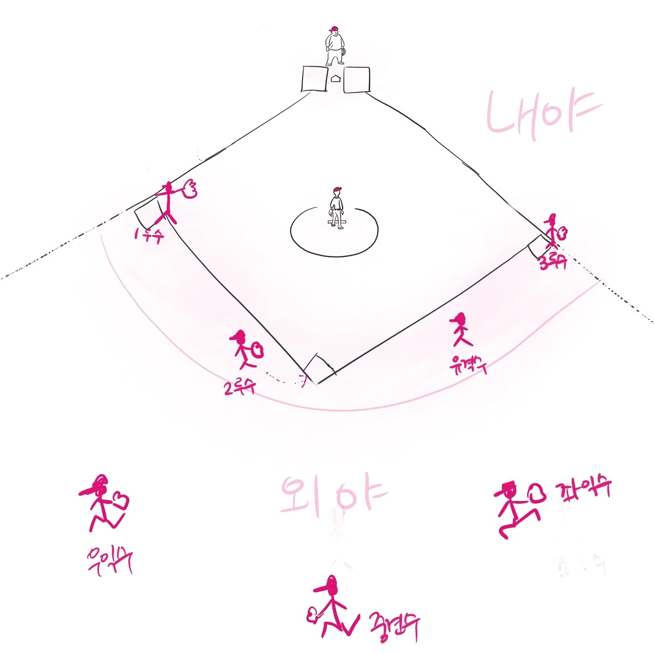 - 포수 방향에서 마주 봤을 때 왼쪽 편 부터 1루수, 2루수, 3루수, 그리고 유격수(2-3루 중간에)
