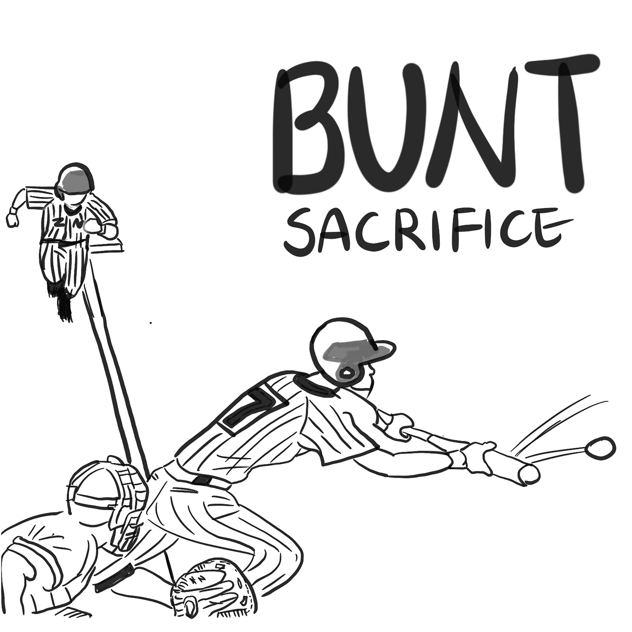 아웃 되더라도, 경기를 이어 가야하기 때문에 보통은 무사(아웃이 없는 상황)이 많습니다. 보통은 이렇게 공을 툭 대서 1-2루의 주자를 2-3루로 이동시키는 번트를 많이 합니다.