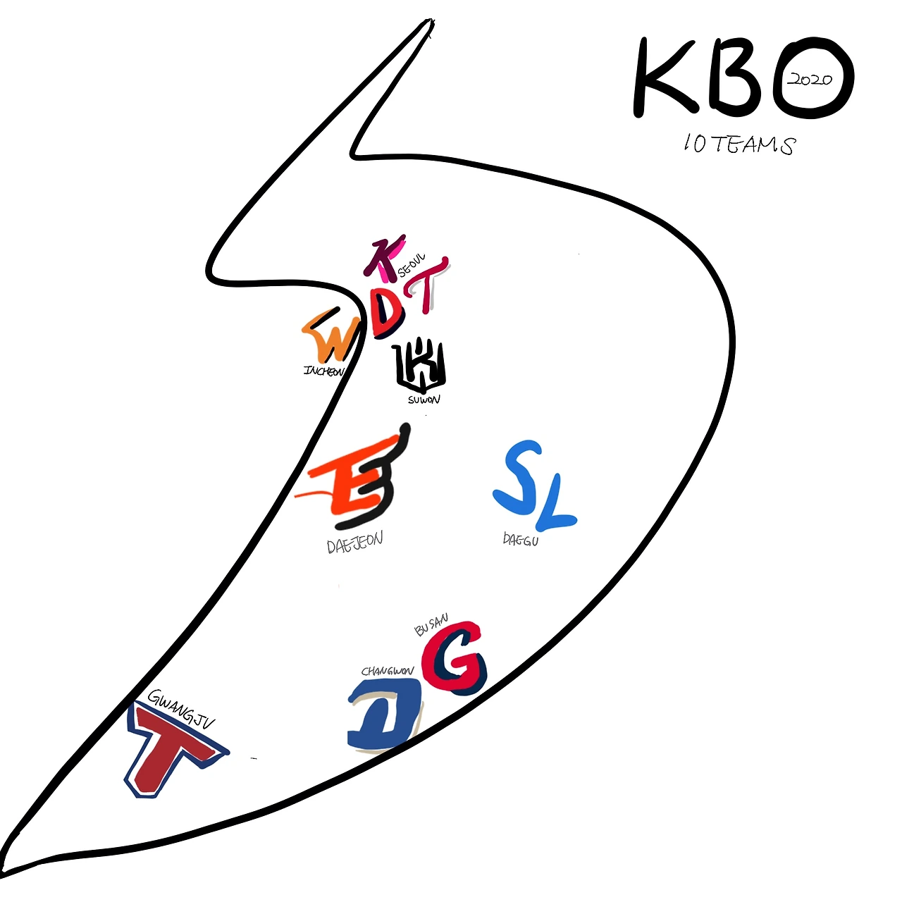 야구는 지역 연고로 합니다. 연고지라고 하는데요, 지역별로 한 팀씩 있습니다. 일본 야구도, 미국 야구도 지역별로 팀이 있어요. 되도록이면 겹치는 지역은 없구요. 일본도, 미국도 인구가 많은 도쿄나 뉴욕은 팀이 두 팀씩 있었던 것 같아요. 아무리 그래도 한국은 좀 많이 몰려있긴 합니다. 아무리 인구밀도 때문에 가능하다고는 해도, 지도를 직접 손으로 그리다보니 심하긴하다 싶은 생각은 들었어요.