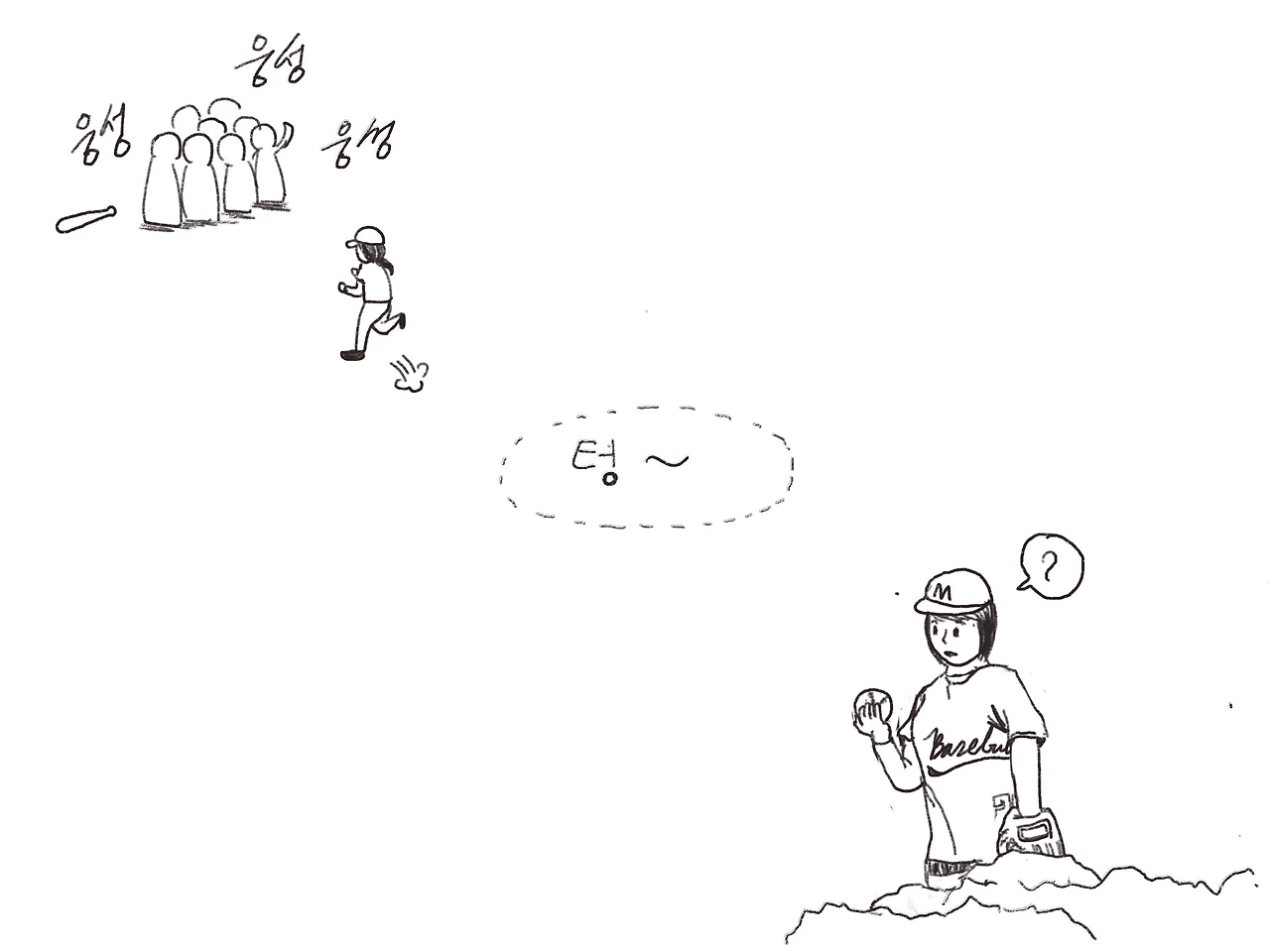 남자팀 선수 중에 한 명이 머리를 싸매고 털썩 앉아있다. 여자야구팀 선수가 쓰러져있는데 왜 남자팀 선수가 머리를 싸매고 앉아 있는 것인가. 그 이유는 간단하다. 처음에 말했듯 이 운동장은 4팀이 같이 쓰는 공동구역이었기 때문이다. 보통 한 팀이 운동장을 독차지해서 운동을 한다고 생각하지만 그건 쉽지 않은 일이다. '서울'에서 '집 구하기'만큼, '서울 여자야구팀'이 '운동장 구하기'는 쉽지 않다. 운동장도 적은데 '주말'에 전체 사회인 야구팀-남녀노소를 불문-이 야구장을 구한다고 생각해보라. 그래서 보통 경기가 있는 날은 몇 팀이 운동장 한 귀퉁이를 잡고 연습을 같이 한다.