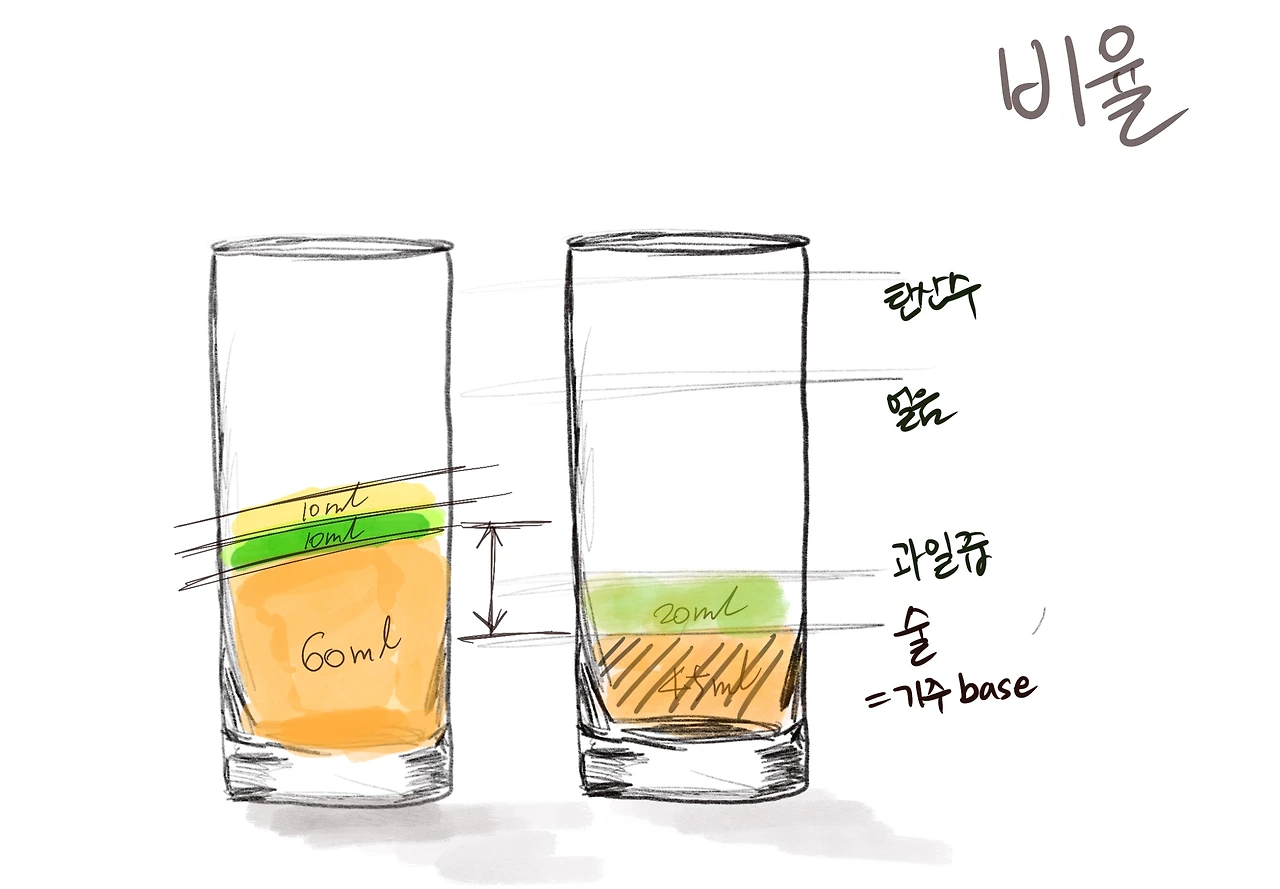그리고 나머지는 간 맞추기다. 커피 아메리카노의 샷 조절하듯이 기본이 되는 술(기주 base)의 양을 조절하고 마무리로 설탕, 라임이나 레몬을 취향에 따라 짜 넣거나 그냥 잘라 넣으면 된다.